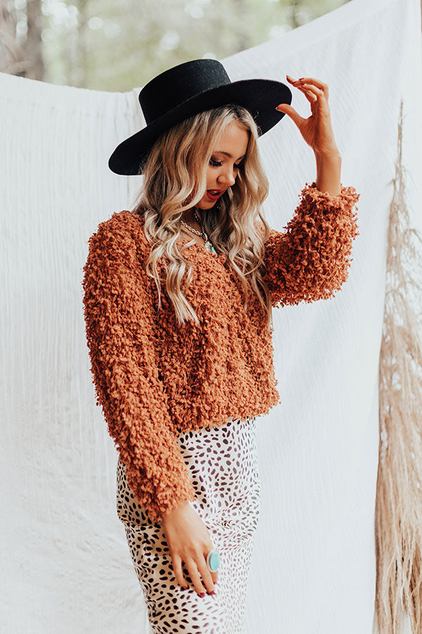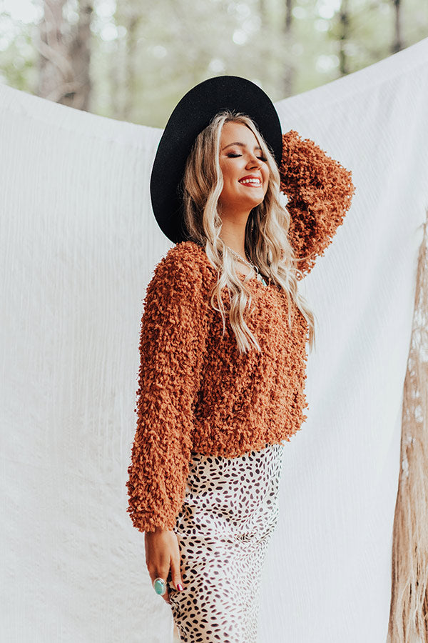 Leaves are falling and autumn is calling! So snuggle up in our adorable rust colored "Central Park Leaves" sweater featuring ultra soft lightweight material with popcorn knit texturing, a high rounded neckline, long loose sleeves, and a relaxed silhouette that falls into a straight hemline! Measurements