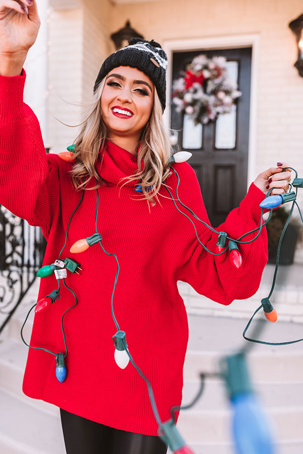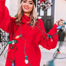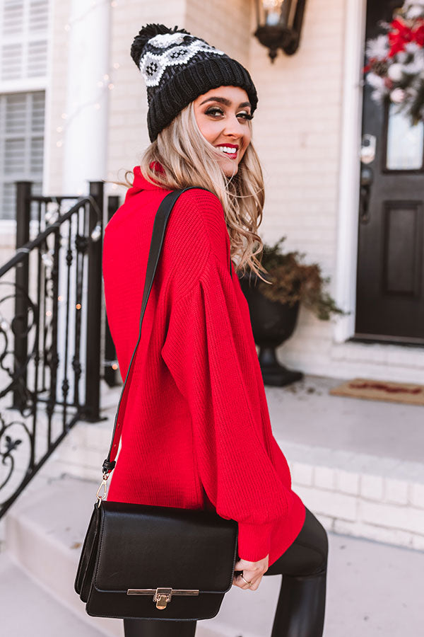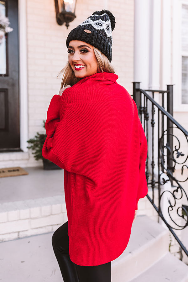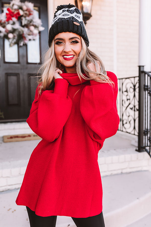 Stay warm and protected from that chilly Central Park snow with this charming red tunic sweater featuring soft lightweight tight knit material, a bunched turtle neckline, long loose sleeves with fitted cuffs, and a slouched silhouette that falls into a straight upper-thigh length hemline! Measurements