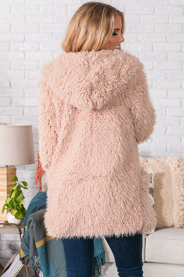 You will look stunning in Central Park when you wear this fluffy light blush coat featuring a hooded back, long sleeves, and an open front silhouette that falls into a straight hemline! We have styled this piece over a simple white tee with some distressed ankle skinnies, peep toe booties, and a chic handbag, but you can also style it with a grey basic tank underneath tucked into our "Weekend In NYC Ribbed Velour Skirt in Black" and grey accents like "The Haven Faux Suede Knee High Boot in Dark Grey" and our "Name Dropper Hat in Grey!" Measurements