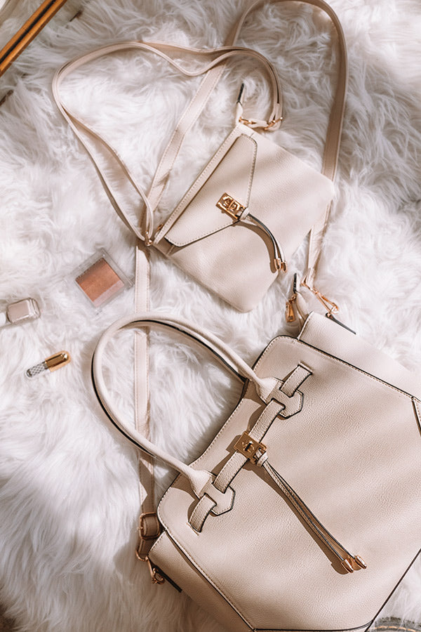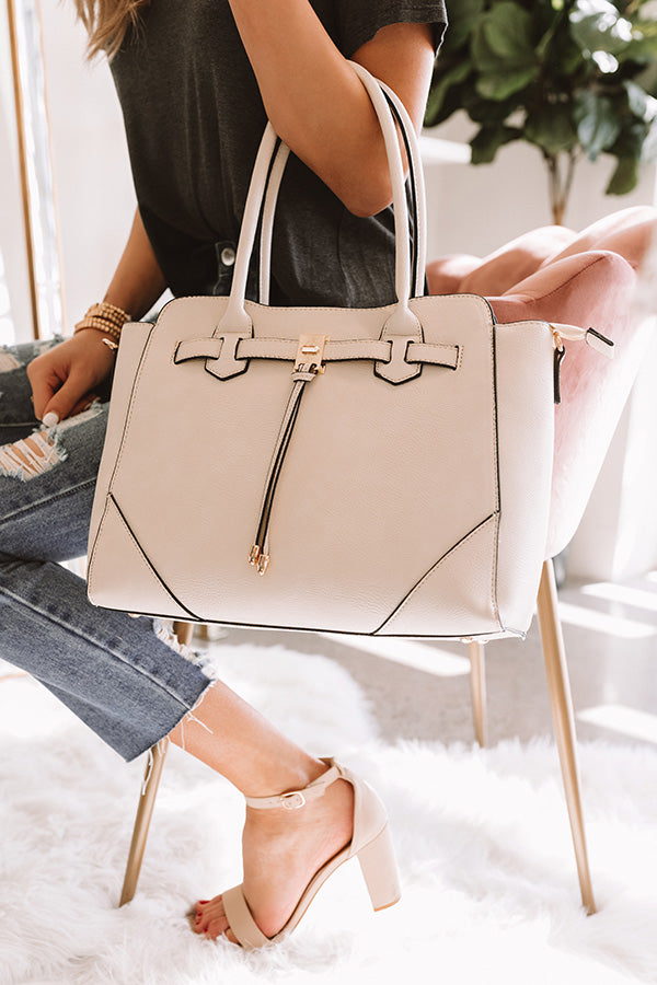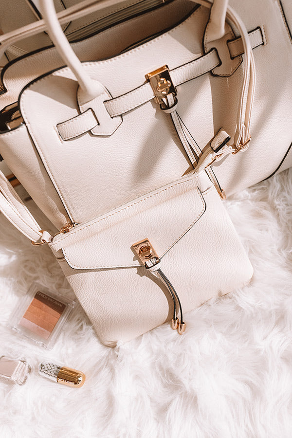 You will surely look like "CEO material" when you accessorize with this chic cream colored tote featuring sleek faux leather material, an adjustable and removable shoulder strap, two short handles, gold hardware, and a spacious fully lined rectangular pouch with a zip closure and additional inside pockets! PLUS, it includes a removable crossbody with a flap closure and an adjustable shoulder strap!