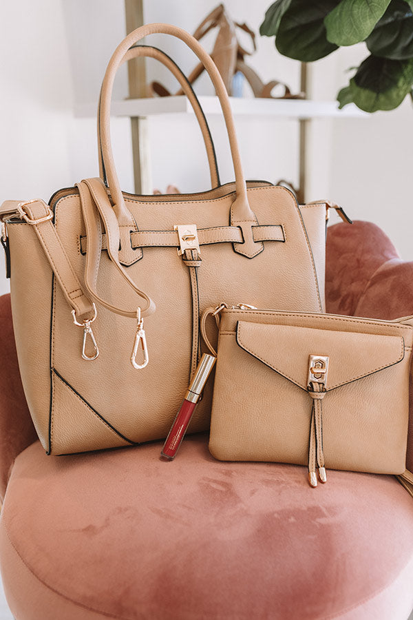 You will surely look like "CEO material" when you accessorize with this chic iced latte colored tote featuring sleek faux leather material, an adjustable and removable shoulder strap, two short handles, gold hardware, and a spacious fully lined rectangular pouch with a zip closure and additional inside pockets! PLUS, it includes a removable crossbody with a flap closure and an adjustable shoulder strap!