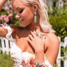 You are sure to be the "CEO of chic" when you accessorize with these stunning statement earrings featuring silver flower studs and dangling rectangle turquoise stones!
