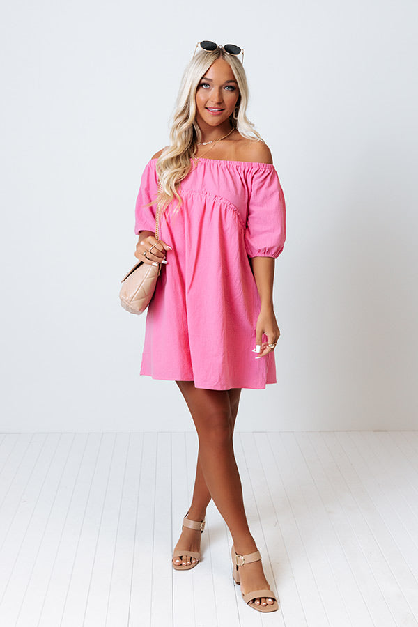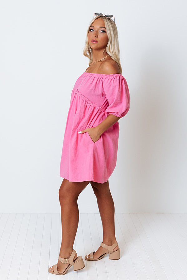 You will be certified as chic when you arrive in this pretty pink dress featuring lightweight material, a straight elastic off-shoulder neckline with short drop puff sleeves, accent side pockets, and a relaxed babydoll silhouette that falls into a straight mid-thigh length hemline!