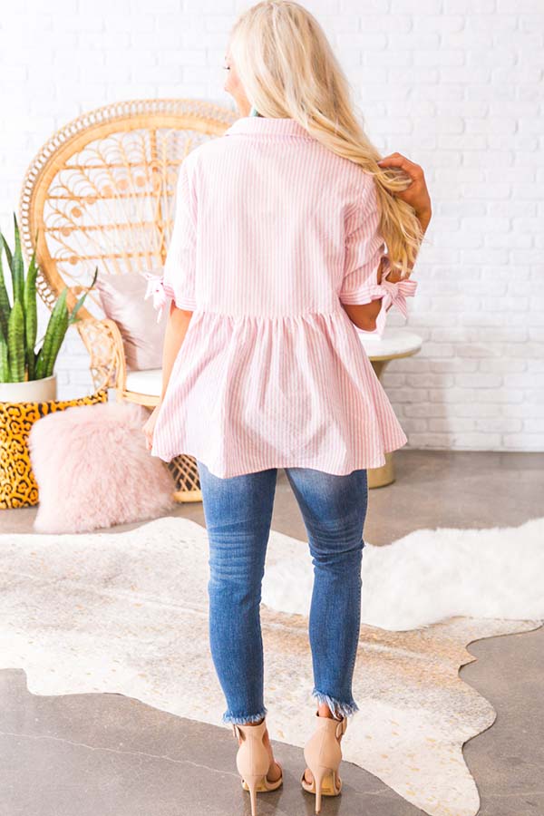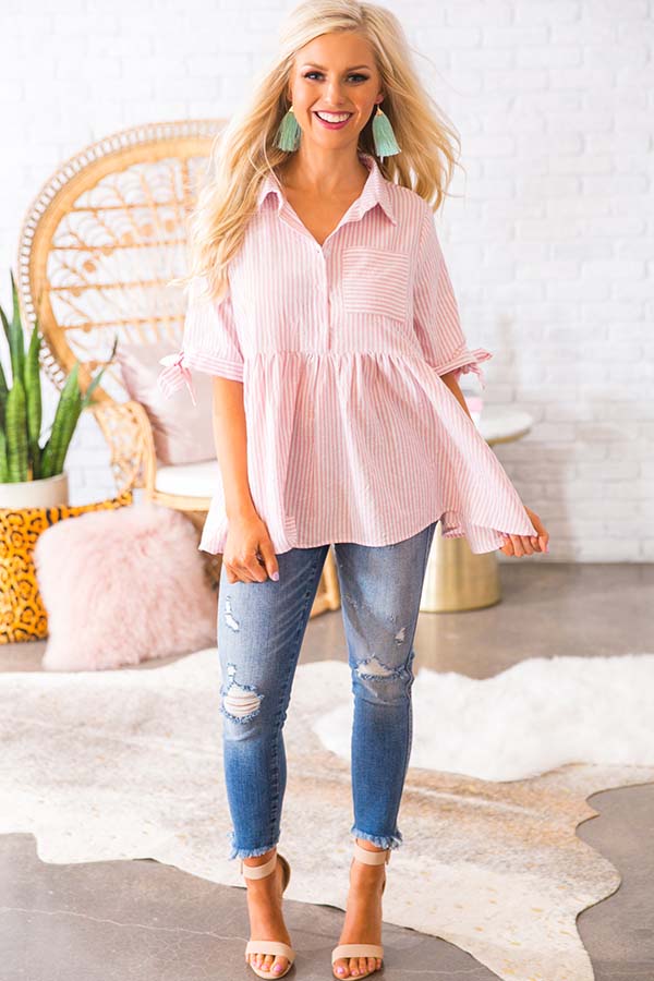 From a picnic in the park to shopping on Park Ave., this classic cutie has got you covered! This striped sweetie has a collared button-down neckline with front accent pocket, quarter-length sleeves with tie cuffs & an ultra breezy babydoll bodice. Style with your favorite denim for a feminine look everyone will be fussing about!