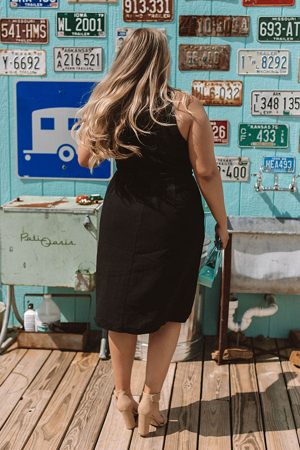 Plus Size - If you're looking for a foolproof piece to wear for a "champagne celebration," then look no further! This stunning little black dress features lightweight breezy material, a v-cut neckline, spaghetti straps with a wide racerback fit, a flattering waistline, and a relaxed skirt silhouette that falls into a knee-length tulip hemline! You can style this party piece a variety of ways, like with a glitzy heel and clutch, or you can add a pop of color by wearing it with "The Everly Patent Heel in Blush" and our "Sweet Pearl Velvet Headband in Blush!" Measurements