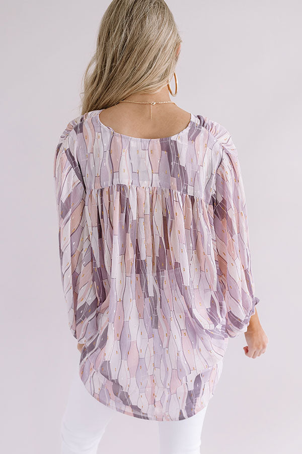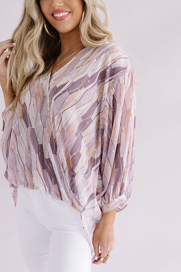 Dress to impress in our adorable "Champagne Charm Top" featuring ultra lightweight breezy material patterned with an intricate purple hued geometric pattern, a wrapped bodice with a v-cut neckline, long oversized sleeves with fitted elastic banded cuffs, and a relaxed silhouette that falls into an uneven hemline! We have styled this cutie with some white skinnies and a light pink heel and tote, but you can also wear it with some distressed denim shorts, our "Pretty And Poised Rhinestone Hair Clip Set in Pink," and "The Sydney Wedge in Gold!" Measurements