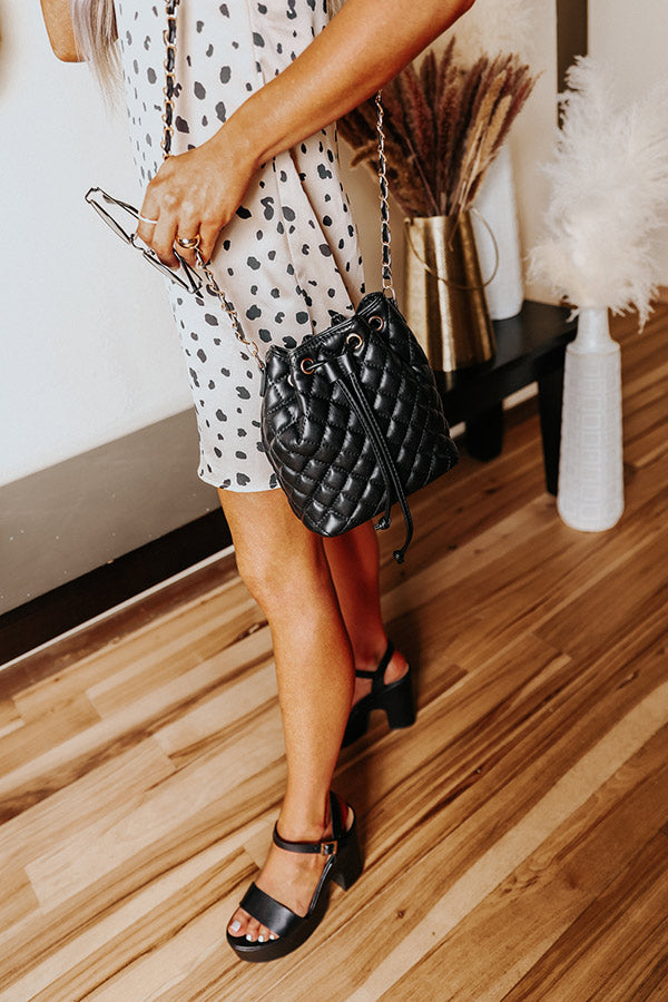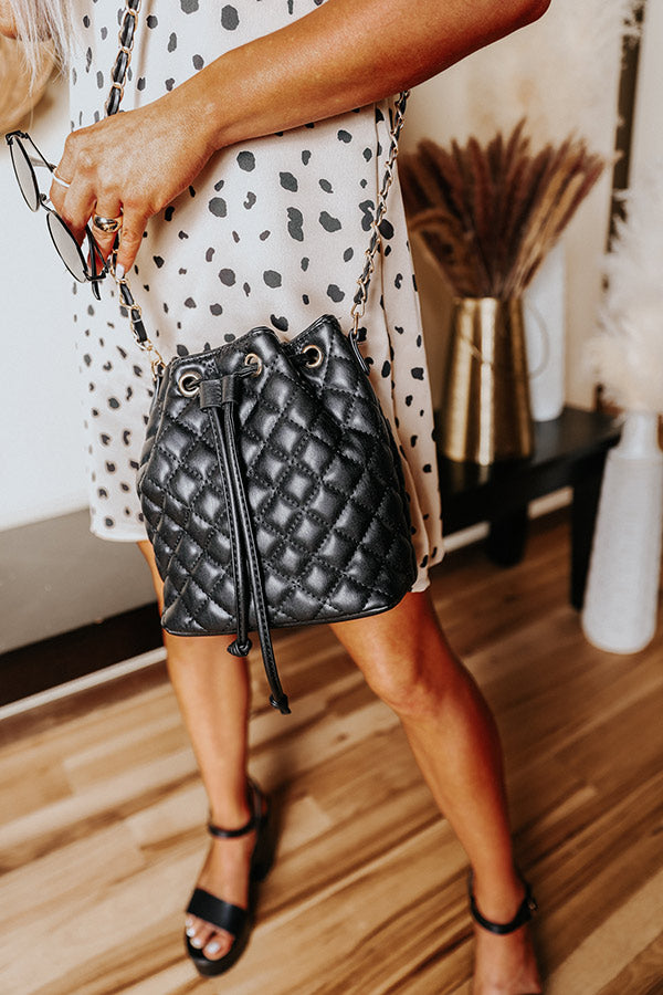 Complete your look in the best way with our trendy black 'Champagne Craving' crossbody featuring faux leather material with quilted texturing, a chain link shoulder strap, and a lightweight fully lined bucket bag silhouette with a cinched closure and an additional zip closure pocket!