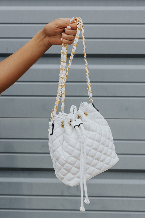 Complete your look in the best way with our trendy white 'Champagne Craving' crossbody featuring faux leather material with quilted texturing, a chain link shoulder strap, and a lightweight fully lined bucket bag silhouette with a cinched closure and an additional zip closure pocket!