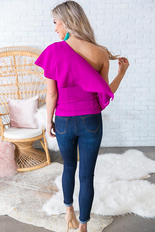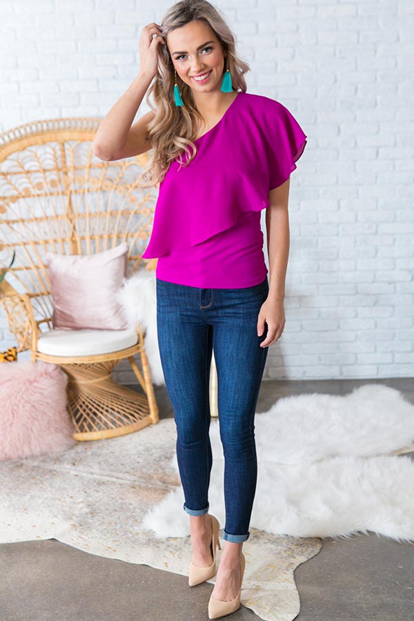 The perfect top for girls night out or dinner & champagne for two! This top has a one-shoulder neckline with a chic chiffon ruffled shoulder & bust, and a stretchy fitted bodice. Pair with skinny jeans & a sassy heel for the ultimate weekend worthy look.
