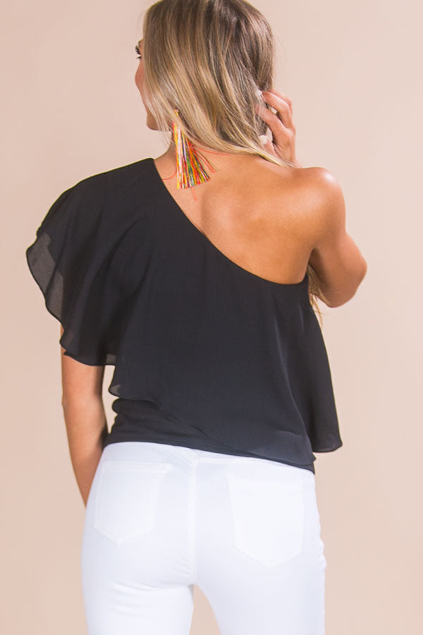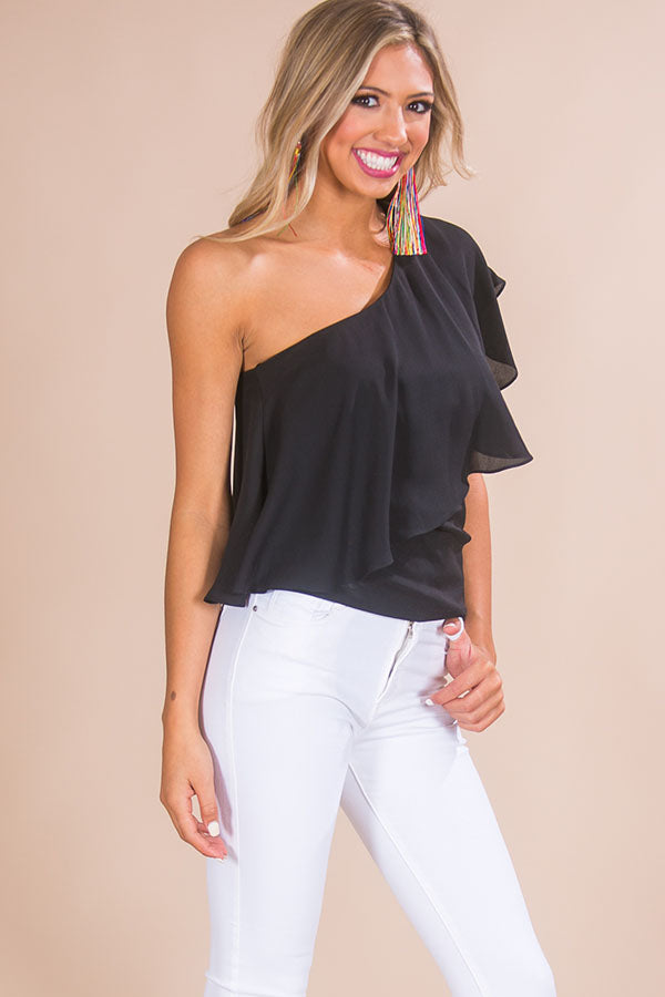 The perfect top for girls night out or dinner & champagne for two! This top has a one-shoulder neckline with a chic chiffon ruffled shoulder & bust, and a stretchy fitted bodice. Pair with skinny jeans & a sassy heel for the ultimate weekend worthy look.