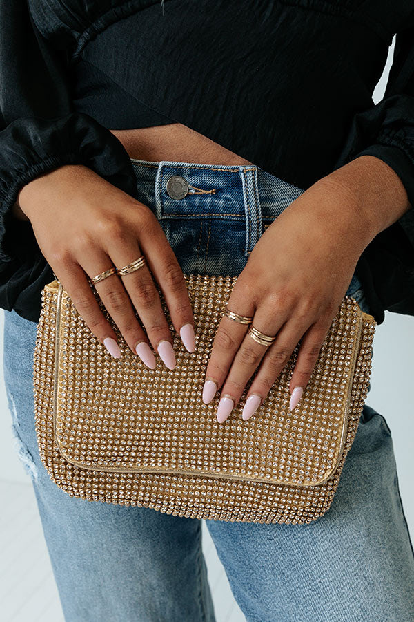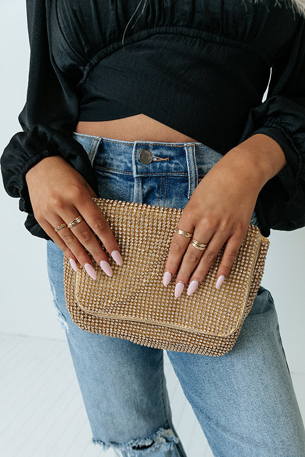 The perfect eye-catching bag, our luxe 'Champagne Hangout' purse featuring shimmering gold rhinestones, a flap closure with a single magnet button, and a spacious fully lined satin interior!