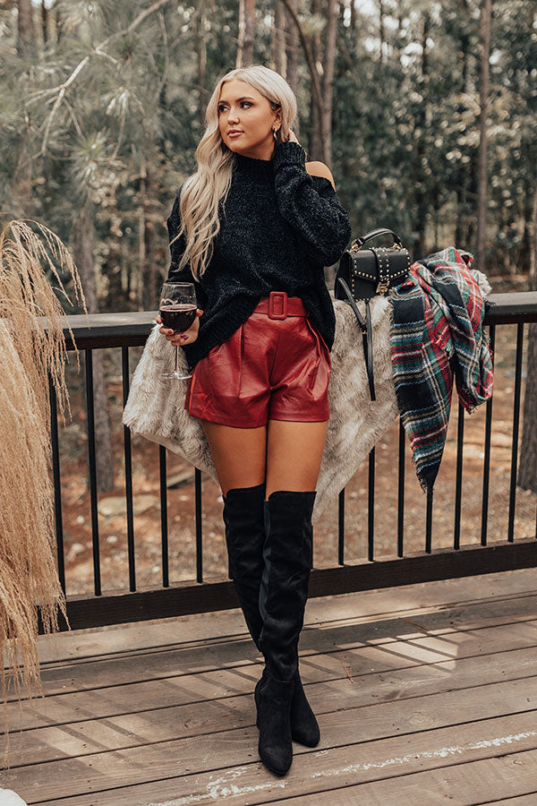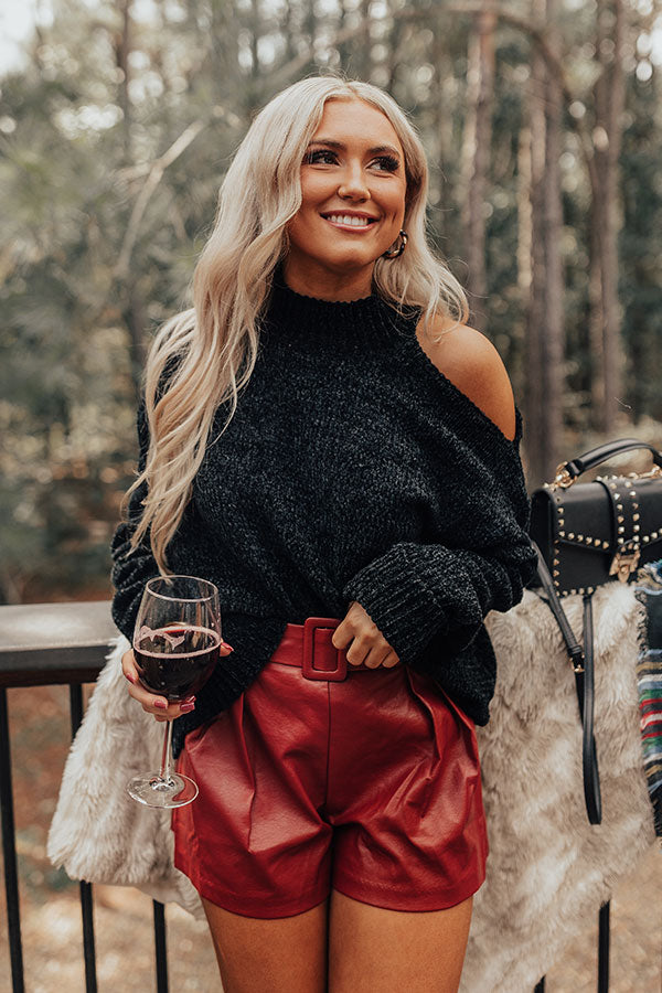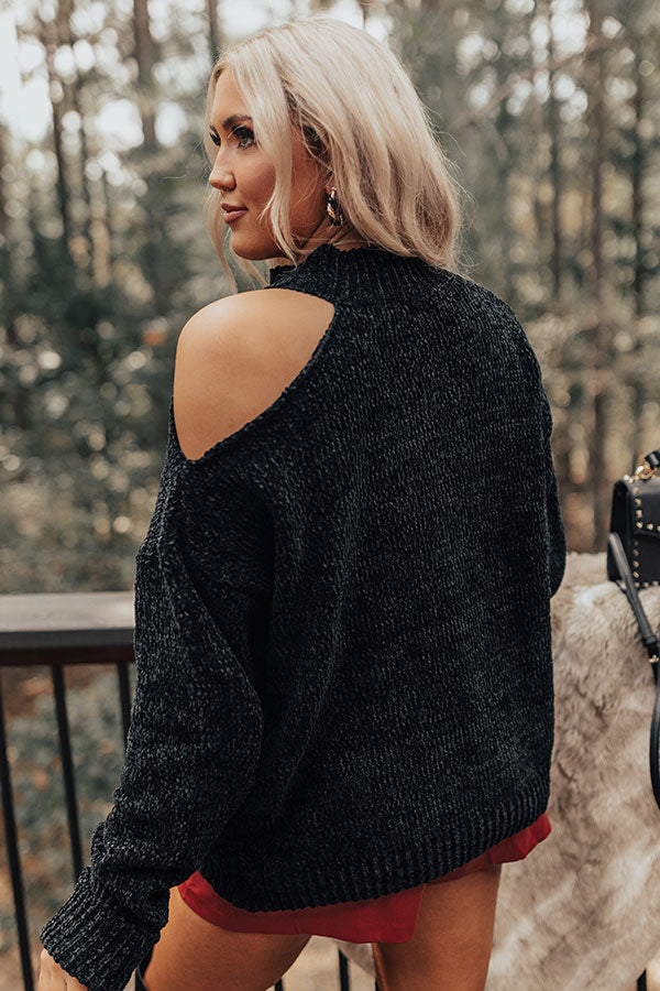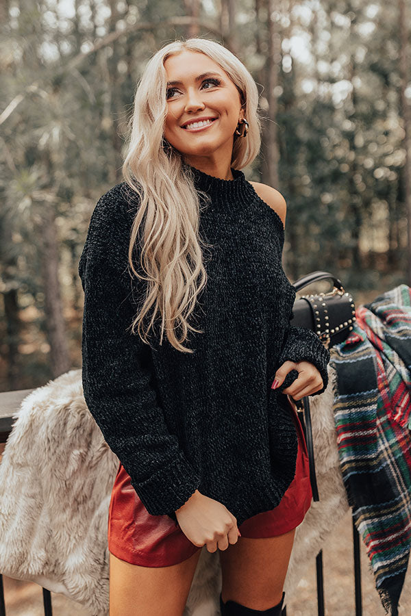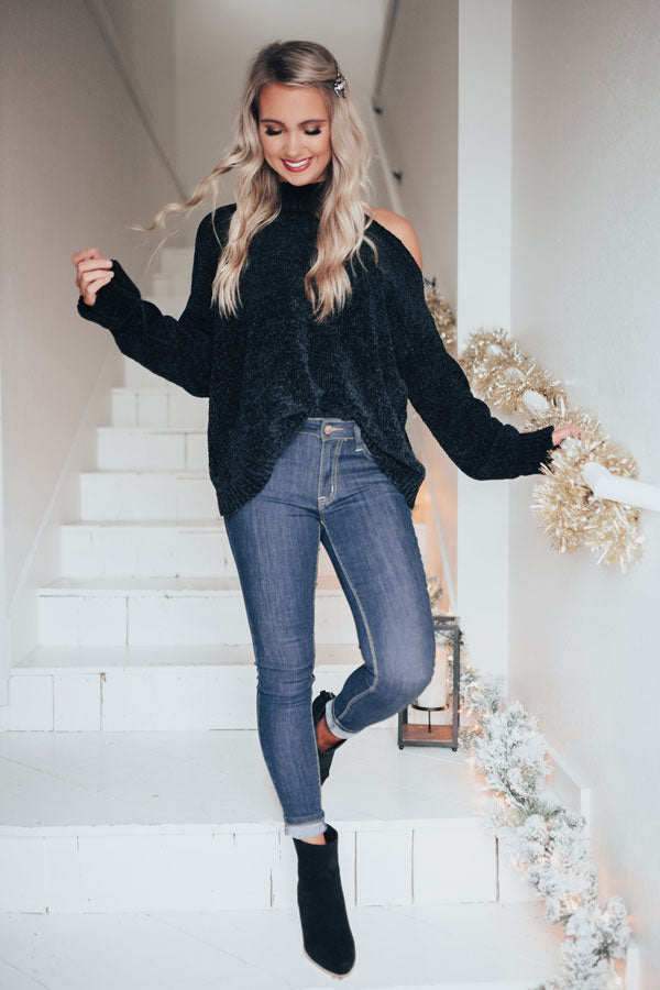 There is no better piece to wear while enjoying champagne in Aspen than this gorgeous black sweater featuring soft lightweight tight knit chenille material, ribbed trim detailing, a high turtle neckline, long loose sleeves with fitted cuffs and a left cold shoulder cutout, and a relaxed silhouette that falls into a straight hemline! Measurements