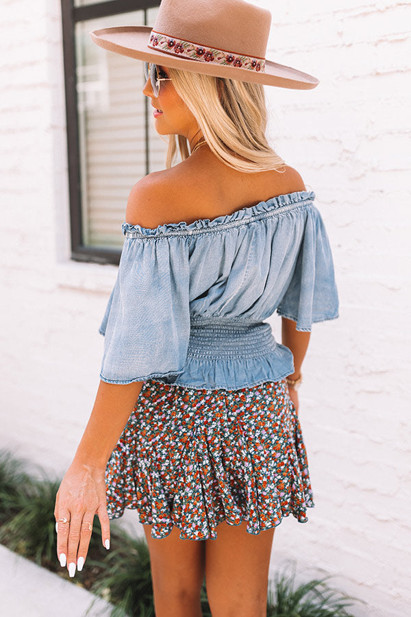 You are guaranteed to look timeless in our charming 'Champagne Kisses' top featuring lightweight light wash chambray material, an elastic off-shoulder fit with a straight ruffle trim neckline, short loose drop sleeves, and a slouched bodice that falls into a wide smocked waistline with a flared hemline! Measurements