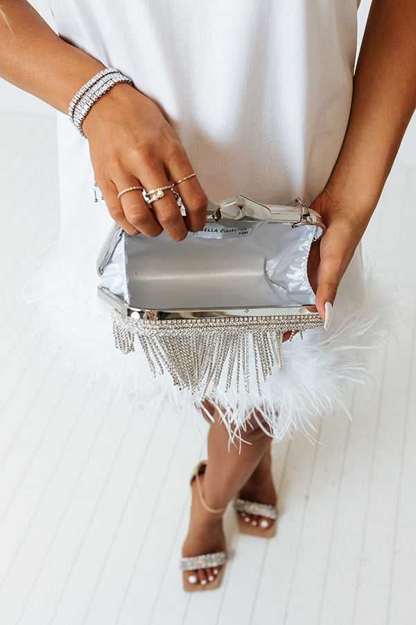 A glamorous essential, our pretty silver 'Champagne Life' clutch features shimmering rhinestone tassel detailing, a single metal handle, and a structured fully lined interior with a pressure snap closure!
