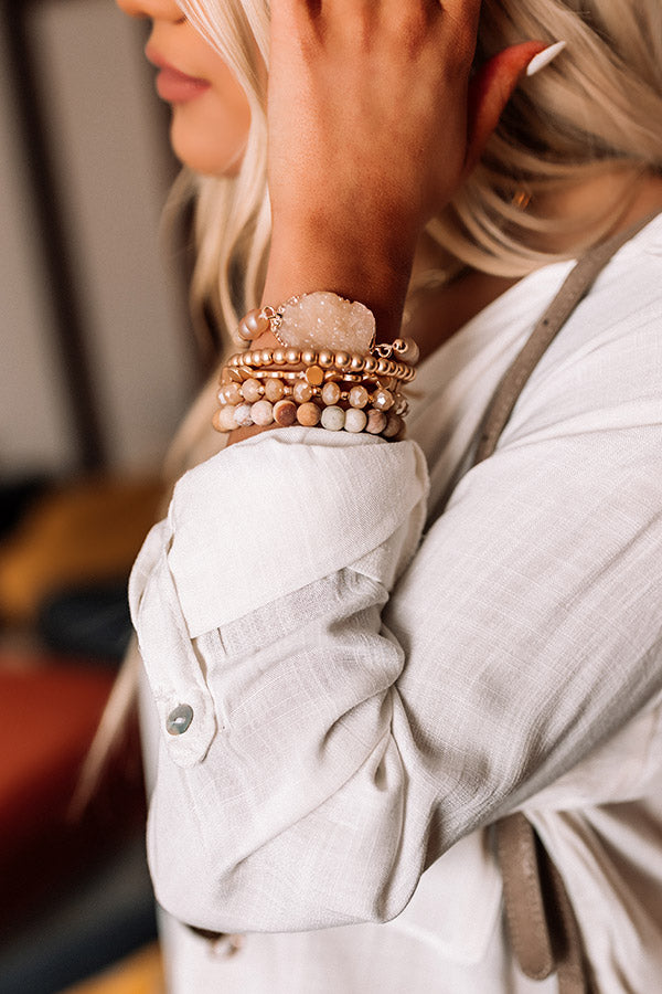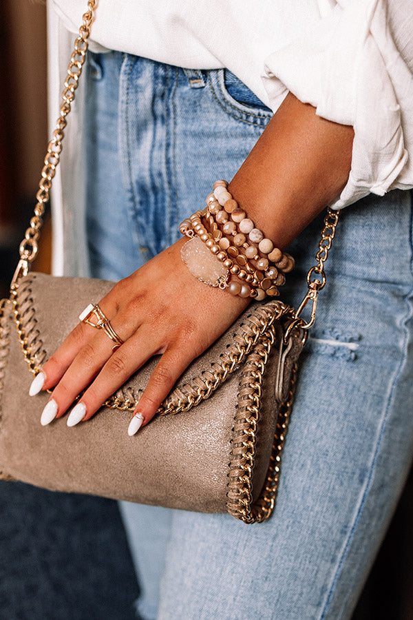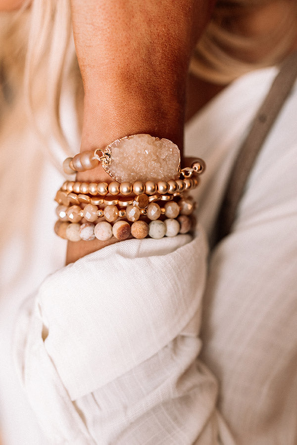 Add to your arm candy stack with our pretty 'Champagne Secrets' bracelet set featuring five pieces of champagne and gold beaded stretch pieces and a druzy stone accent!