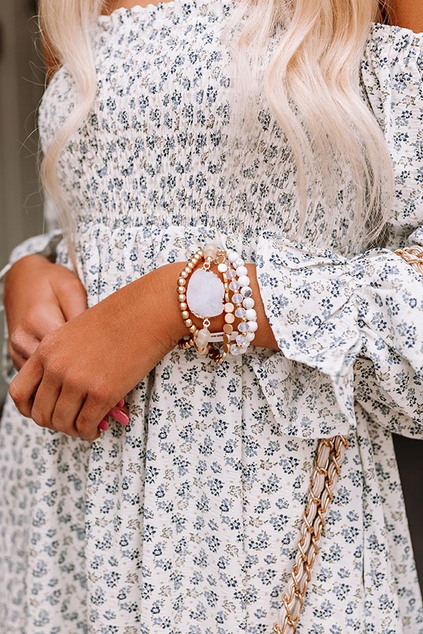 Add to your arm candy stack with our pretty 'Champagne Secrets' bracelet set featuring five pieces of white and gold beaded stretch pieces and a druzy stone accent!