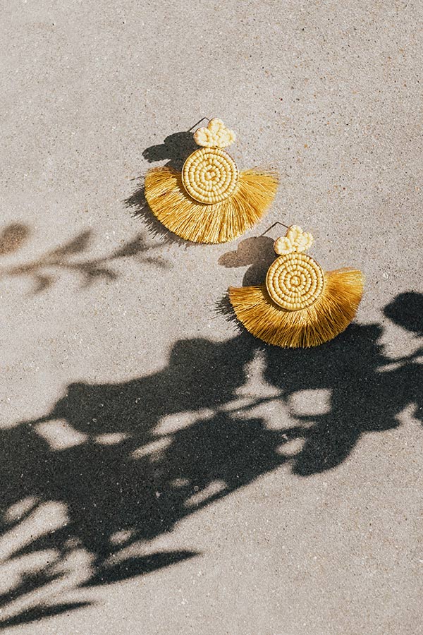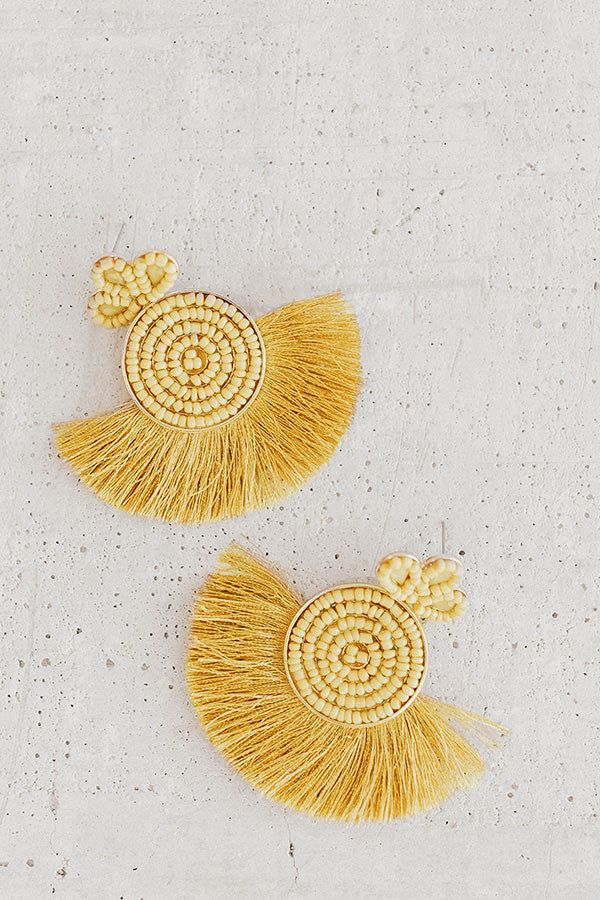 Stay looking stylish white "sippin' champagne" on the beach with these adorable marigold colored earrings featuring flower pedal shaped studs and large beaded circle pendants with accent fans!