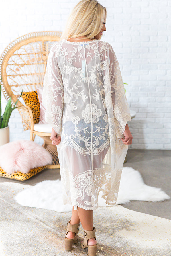 Add an elegant touch to any look with this luxe lace overlay! This cream cutie has quarter-length scalloped sleeves, a breezy open-front silhouette & gorgeous floral embroidery throughout. Style this lace beauty with cut-offs for your next concert, or style her over a dress for your next outdoor wedding... Your options are endless with this sweetie!