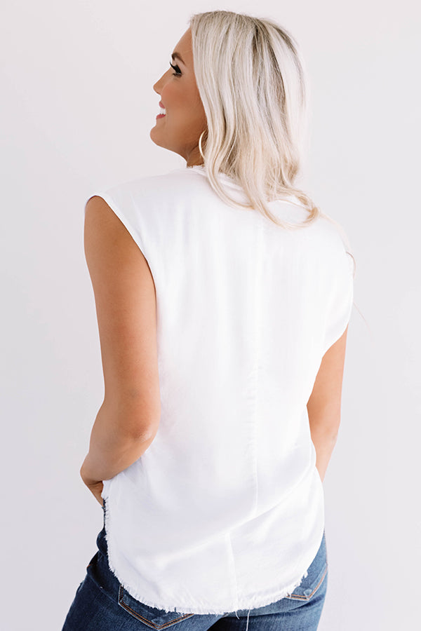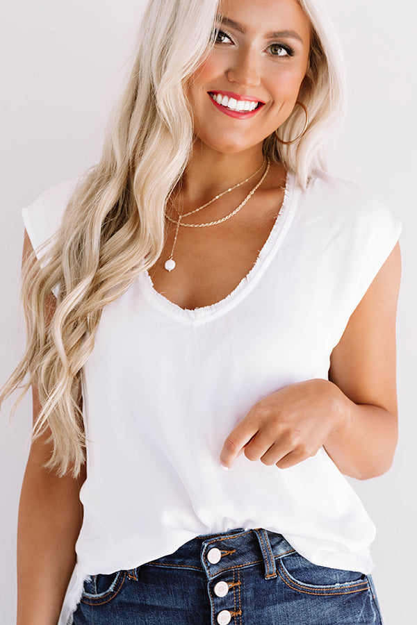 Your options are endless with our casual cute white "Champagne Sparkler" shift top featuring sleek lightweight satin material, a scooped neckline with cap sleeves, frayed edge detailing, and a relaxed silhouette that falls into a rounded hemline! You can style this chic piece a variety of ways, like with some distressed skinnies and a neutral heel and crossbody, but you can also wear it layered under "The Fashion District Cardigan" with some frayed black shorts, sunnies, and "The Ansley Sneaker!" Measurements