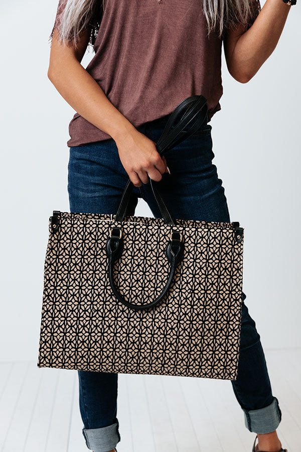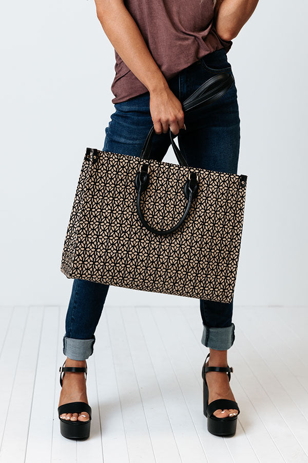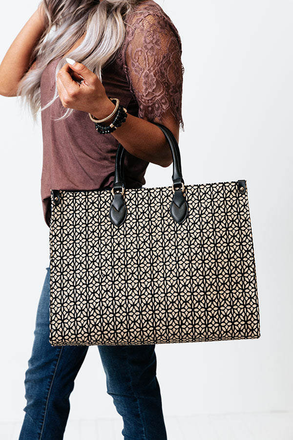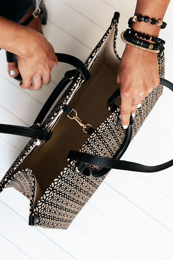You will look like you are carrying a designer bag when you carry our high end black 'Champagne Suggestions Tote' featuring delicate cutout detailing over a woven silhouette, two short and stiff rounded handles and two longer relaxed straps, and a chic square fully lined pouch with a hook clasp closure and an additional inside pocket!