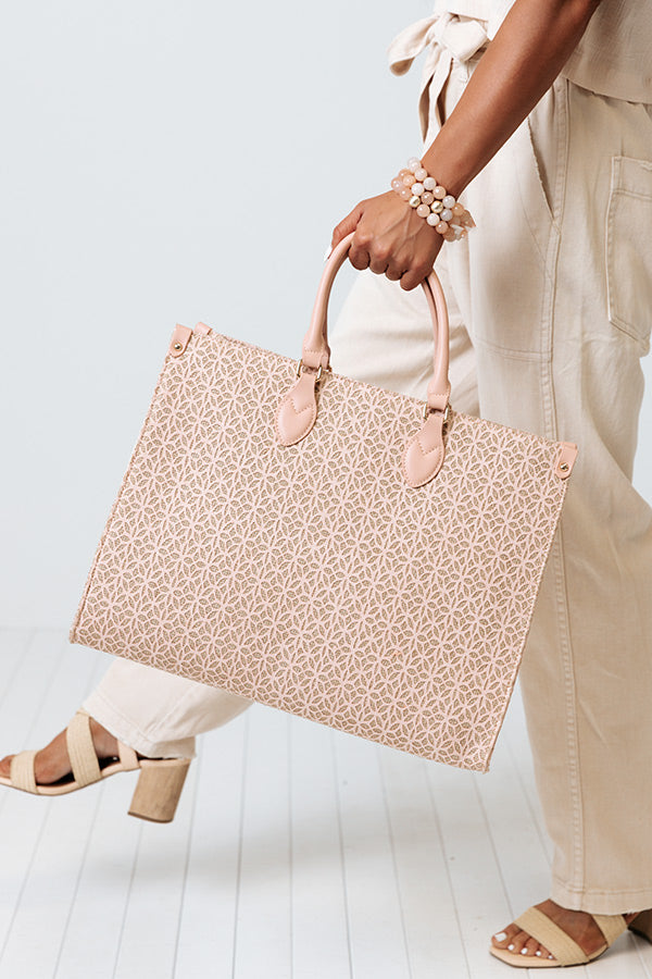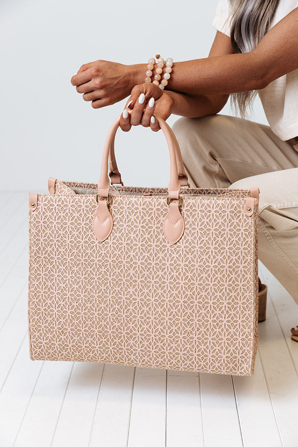 You will look like you are carrying a designer bag when you carry our high end pink 'Champagne Suggestions Tote' featuring delicate cutout detailing over a woven silhouette, two short and stiff rounded handles and two longer relaxed straps, and a chic square fully lined pouch with a hook clasp closure and an additional inside pocket!