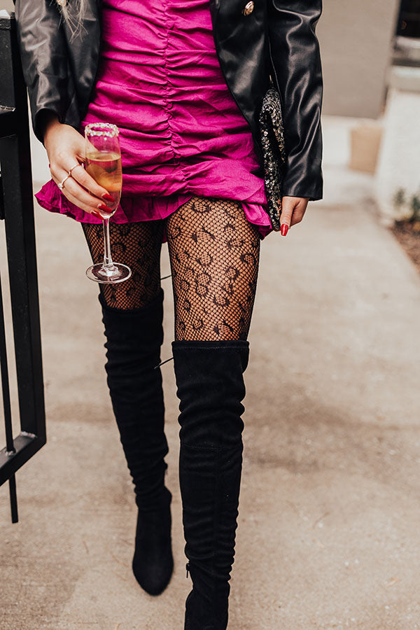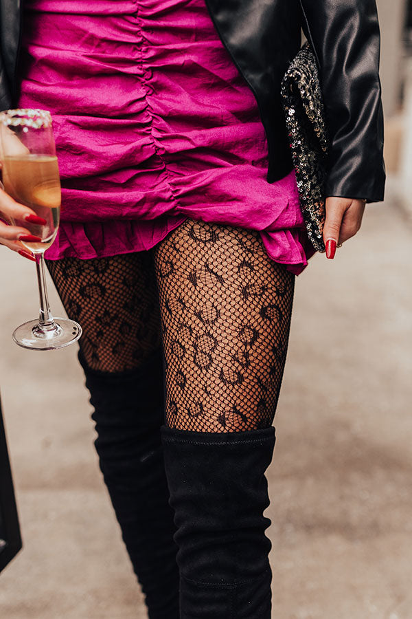 People are sure to toast to how amazing your look in our black 'Champagne Toasts' tights featuring ultra lightweight fishnet material pattered with a cute leopard print! These tights with comfortably fit up to a size 16.
