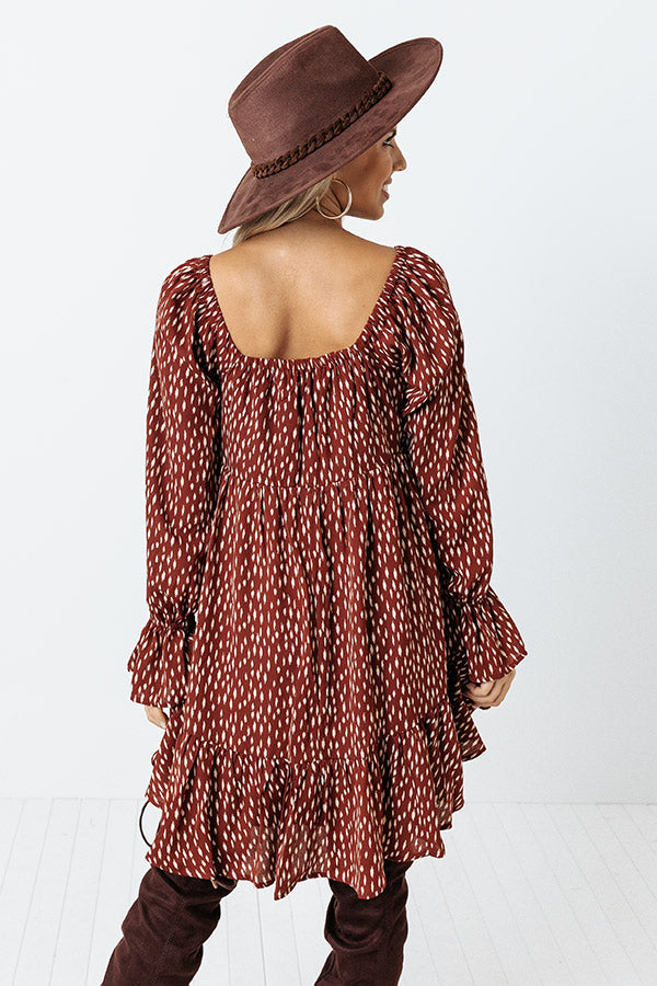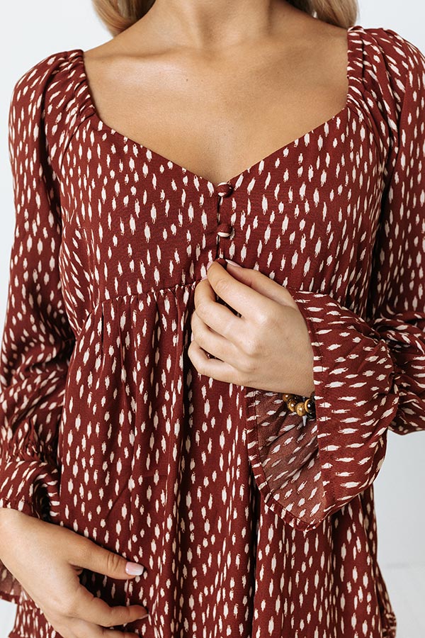 You will look absolutely darling in our pretty dark rust colored 'Chance At Love' dress featuring lightweight flowy material patterned with a white spotted print, a button up bodice with a wide v-cut neckline, an open upper back, long bishop sleeve with bell cuffs, and a relaxed babydoll silhouette that falls into a straight mid-thigh length peplum hemline!