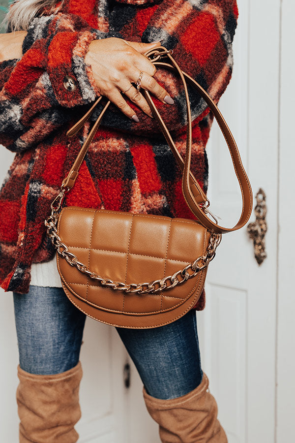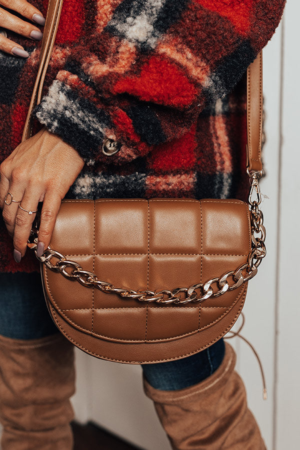 The perfect bag to carry you through the holidays just dropped! Our adorable iced mocha colored 'Chance At Love' crossbody featuring sleek faux leather material with square quilted texturing, a half circle flap closure with a snap button, a short gold chain link handle and an adjustable and removable shoulder strap, and a spacious fully lined interior with an additional zip closure pocket inside!