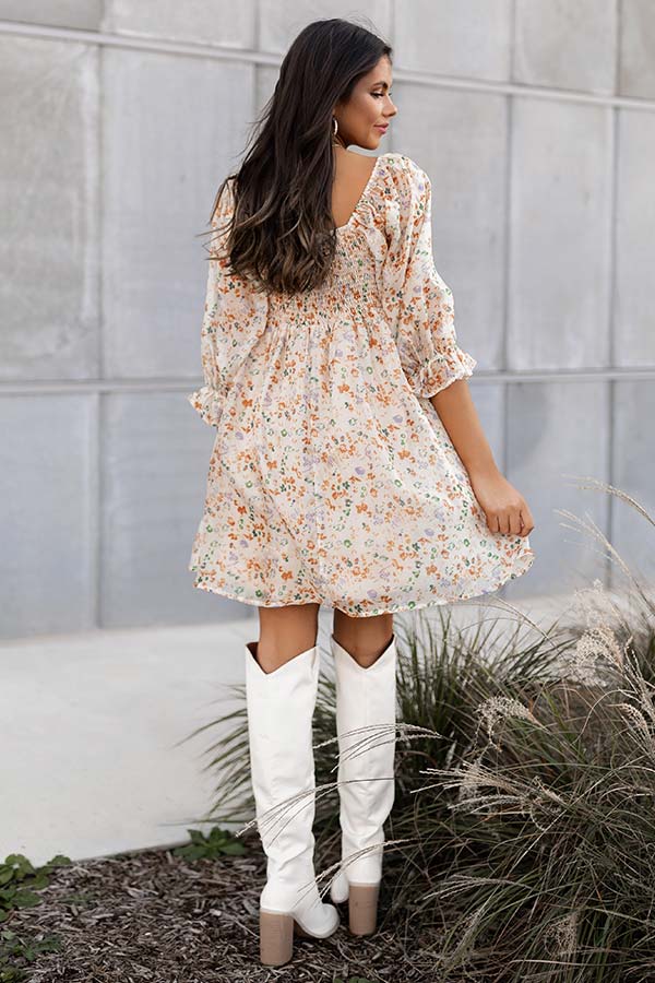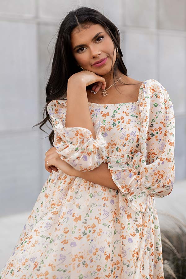 Jaws are sure to drop when you arrive in our stunning ivory hued 'Change Is Coming' dress featuring lightweight material patterned with an orange, green, and lavender floral print, a square neckline and upper back, 3/4-length bishop sleeves with flared cuffs, and a flattering babydoll silhouette that falls into a straight mid-thigh length hemline!
