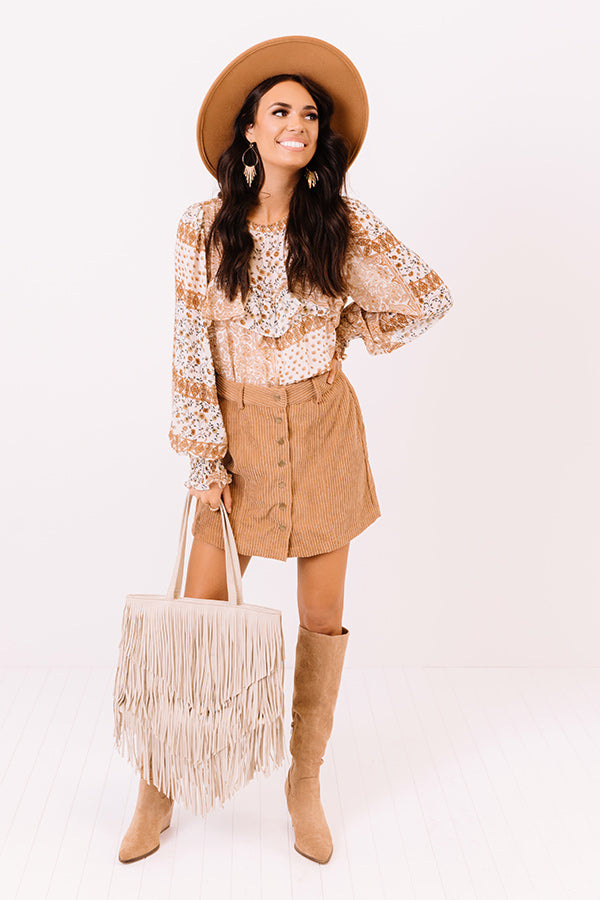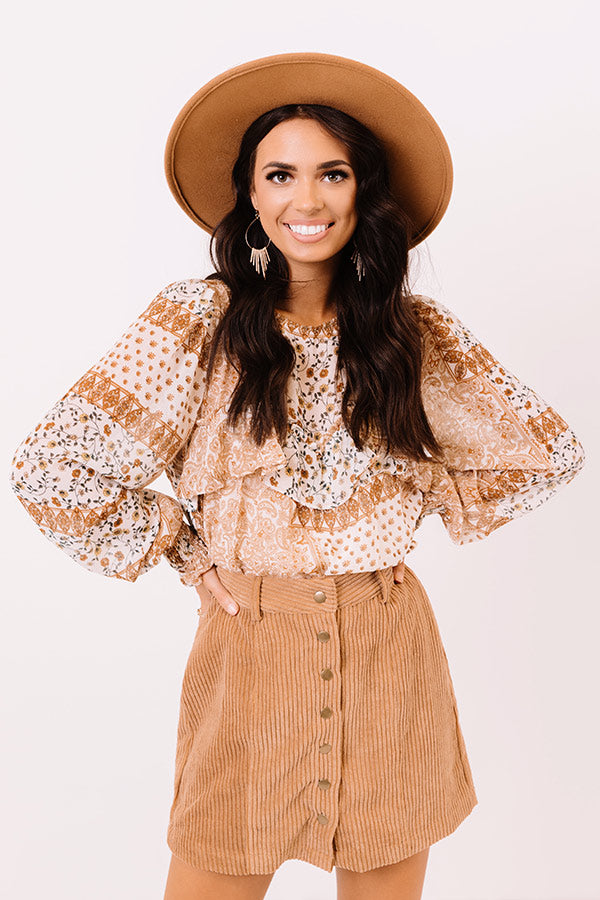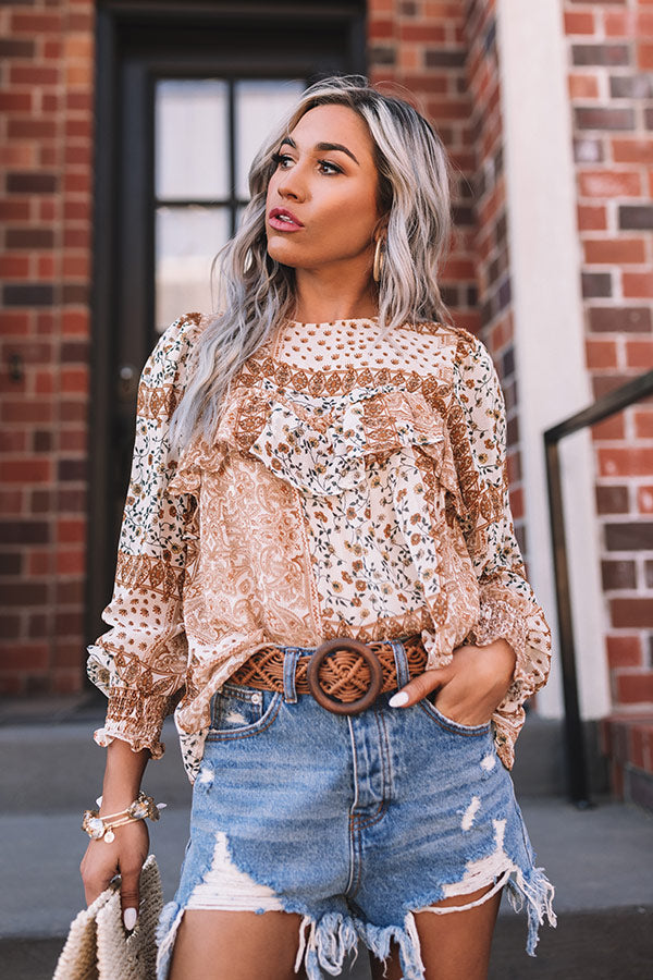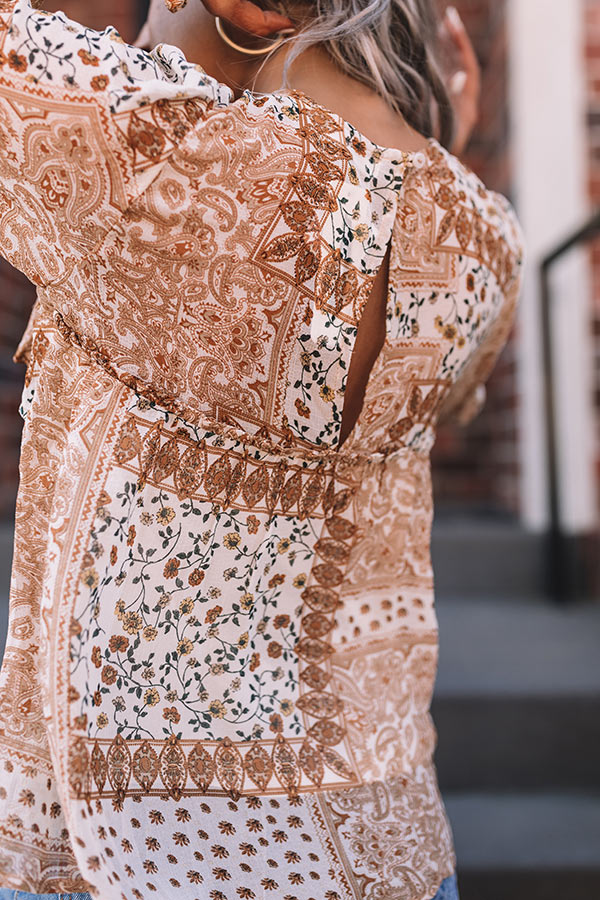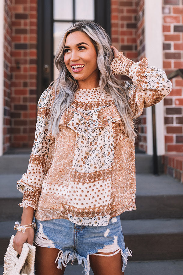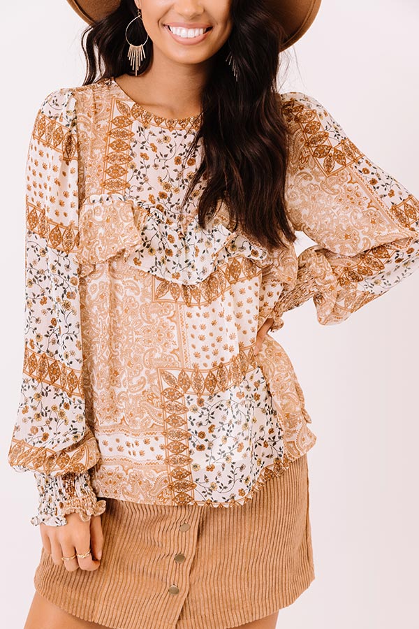 Transition from season to season in style with our charming ivory colored 'Changemaker Shift Top' featuring lightweight material patterned with an intricate camel hued floral and paisley print, a high rounded neckline, long loose sleeves with smocked cuffs, ruffled seam detailing, a keyhole accented upper back with a button closure, and a relaxed silhouette that falls into a rounded hemline! Measurements