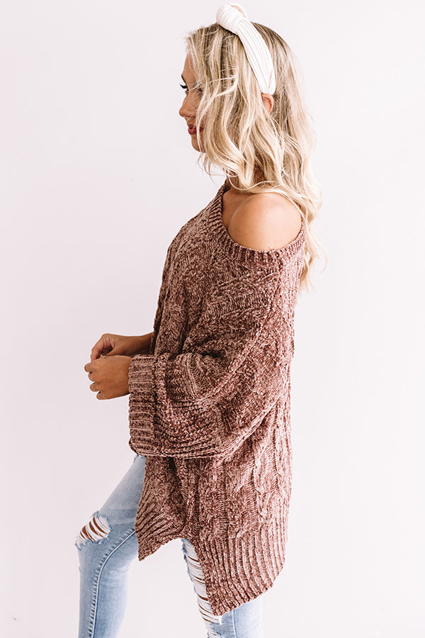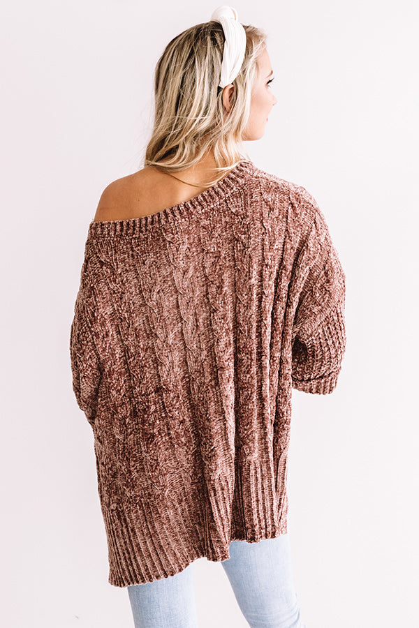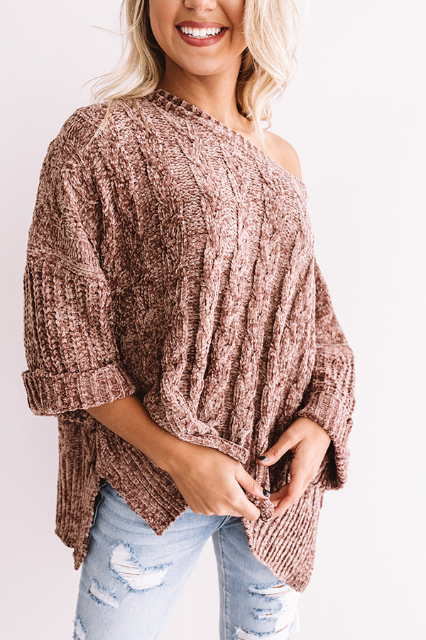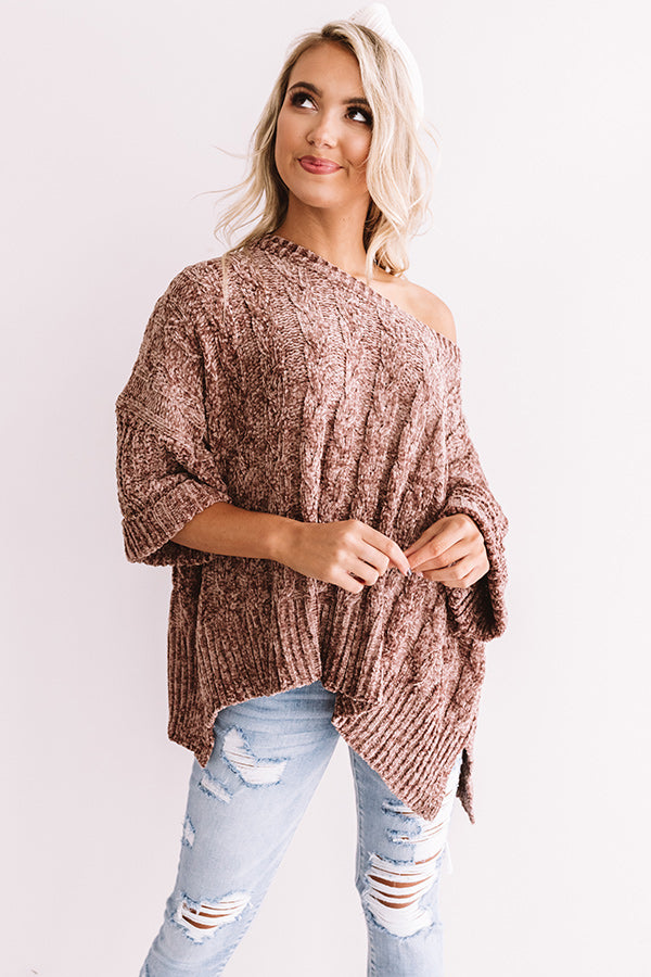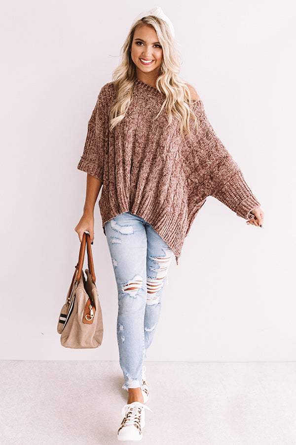 Cozy up for fall in the mocha colored "Chardonnay And Chic" sweater featuring a soft loose knit chenille texture with ribbed detailing, long oversized sleeves with rolled cuffs, a high rounded neckline, and an ultra draped silhouette that falls into an uneven tunic length hemline with side slits! You can style this cold weather essential a variety of different ways, like with some distressed ankle skinnies, a white headband, trendy leopard sneakers, and a neutral tote, or with some black flares and "The Seraphina Faux Leather Wedge in Brown!" Measurements