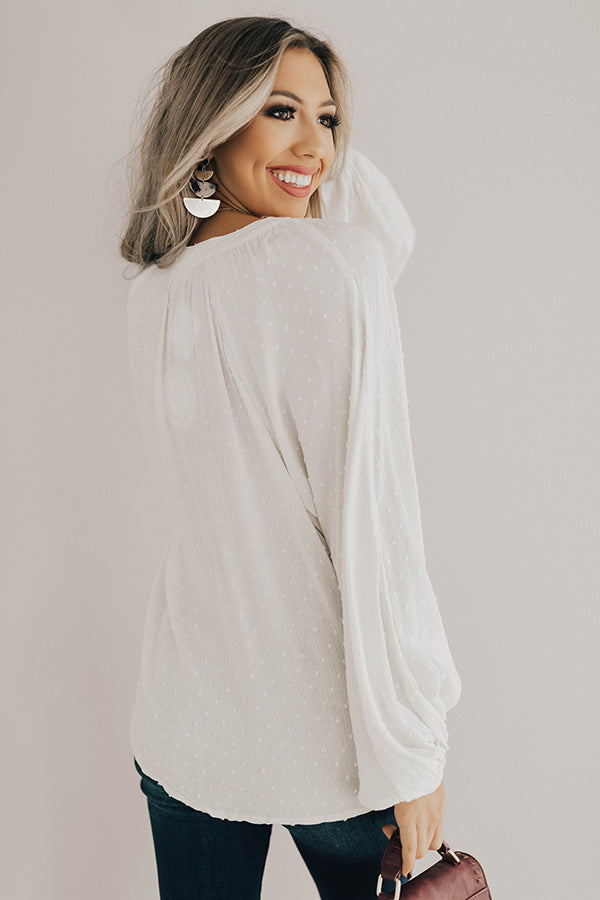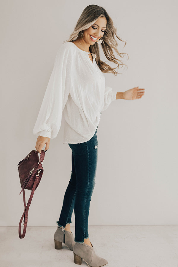 It's a beautiful day for a glass of chardonnay... And the "Chardonnay and Sway Shift Top!" This chic shift top has a button-down neckline, long billowing sleeves with button cuffs, and a relaxed dot-textured rayon bodice. Just add flares, for the ultimate "boho chic" look, or style with skinny jeans and booties for a fabulous fall ready look! Measurements
