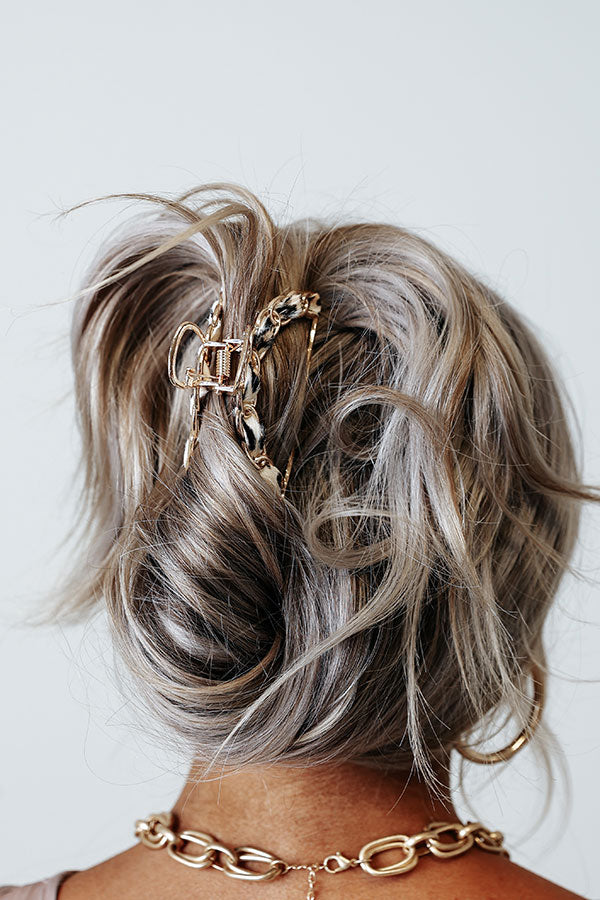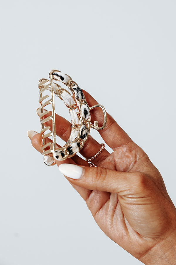 You will look like a total babe when you complete your hair style with this adorable hair claw featuring a half circle chain link silhouette with a white leopard print ribbon!