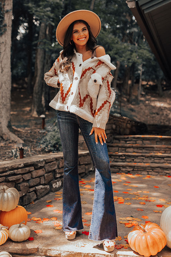 Keep warm all fall long in our darling 'Chardonnay Cuddles Cardigan' featuring ultra thick material patterned with a large aurora red and natural hued zigzag print, long loose sleeves, a button up front with a collared neckline, two accent chest pockets with flap closures, and a relaxed silhouette that ends in a straight hemline!