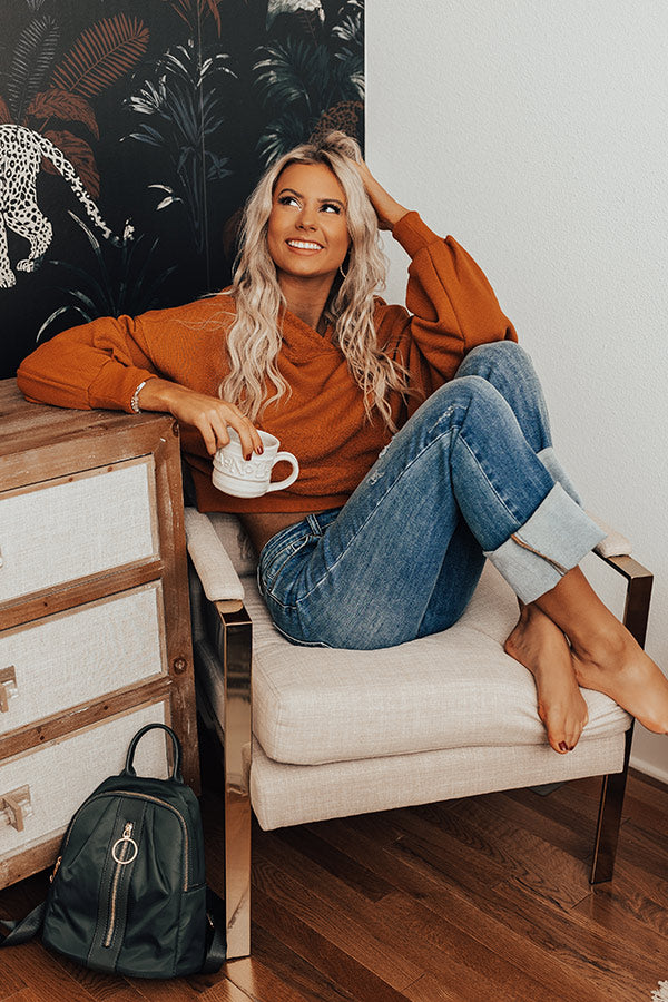 Cozy up in this trendy rust colored hoodie featuring soft material with knit textured accents, a high neckline with a hooded back, long oversized sleeves with fitted cuffs, a kangaroo front pouch, and a slouched silhouette that ends in a straight hemline! Measurements