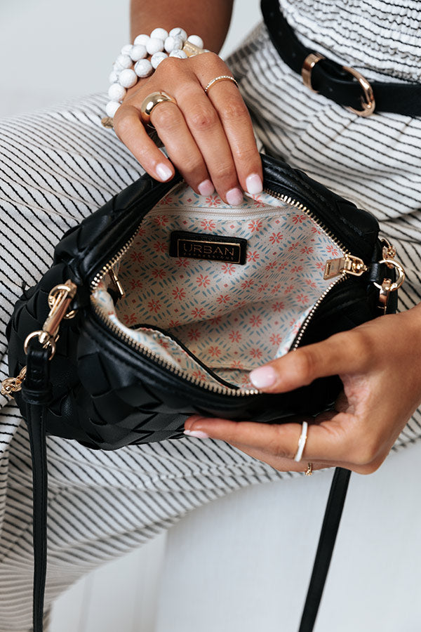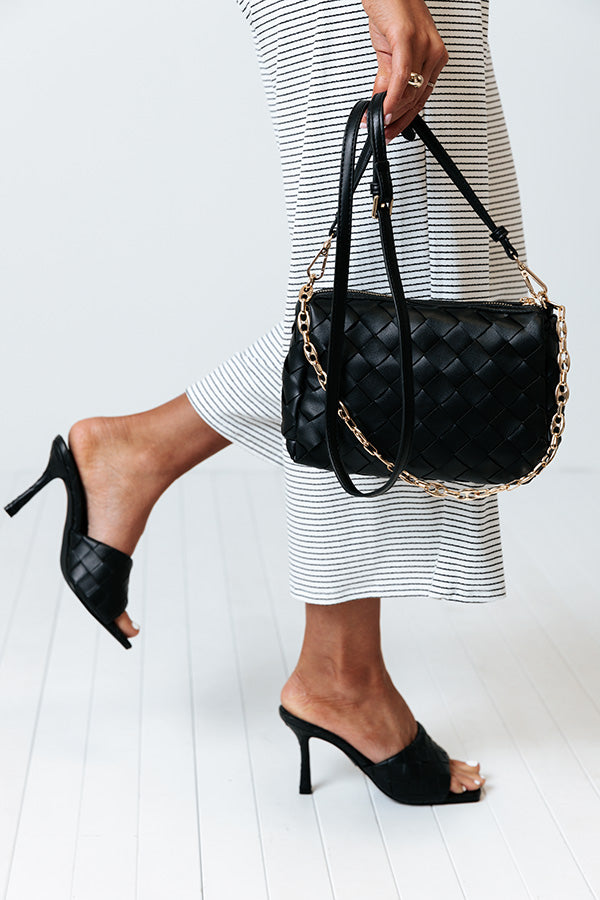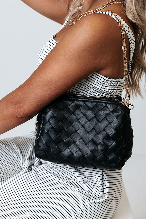 Upgrade your bag collection with our trendy black 'Charming Retreat' crossbody featuring lightweight woven faux leather material, a removable and adjustable shoulder strap, a gold chain link handle, and a spacious fully lined rectangular pouch with a zip closure and an additional inside pocket!