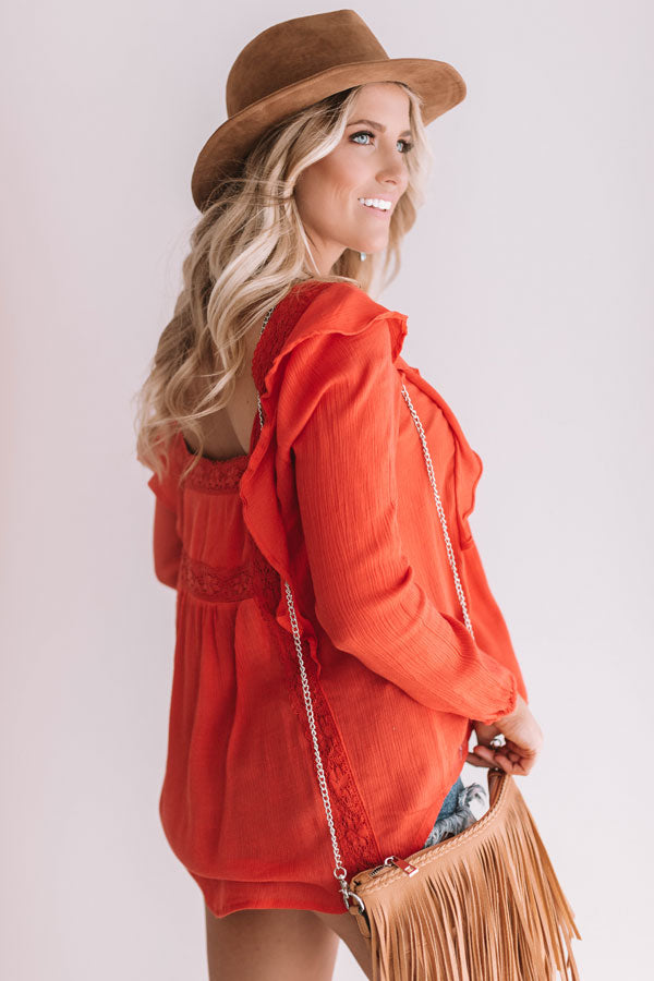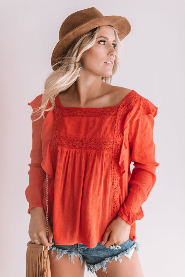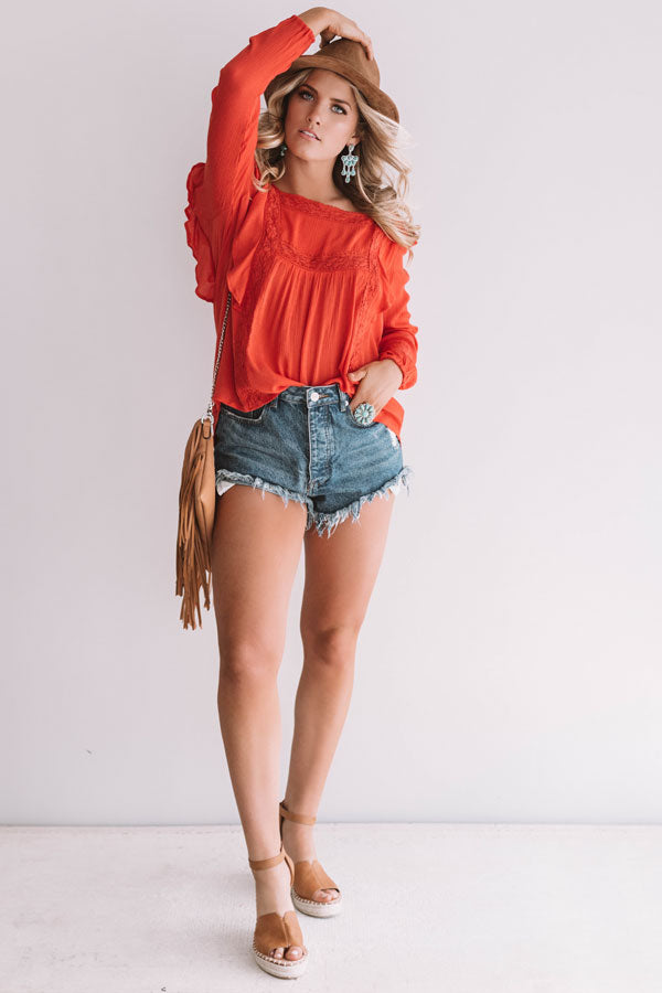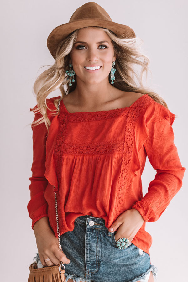 You will be "charmingly chic" when you wear this scarlet shift top adorned with a square neckline and back, long sleeves, ruffled vertical seams, crochet detailing, and loose fit with a rounded hem! You can style this elegant piece with distressed shorts and a neutral wedge, faux suede hat, and fringe crossbody for a cute and casual summertime look, or you can pair it with our "Santorini Sunshine Trousers in White" and "The Parker Faux Suede Lace Up Heel in Scarlet" for an adorable working girl outfit! Measurements