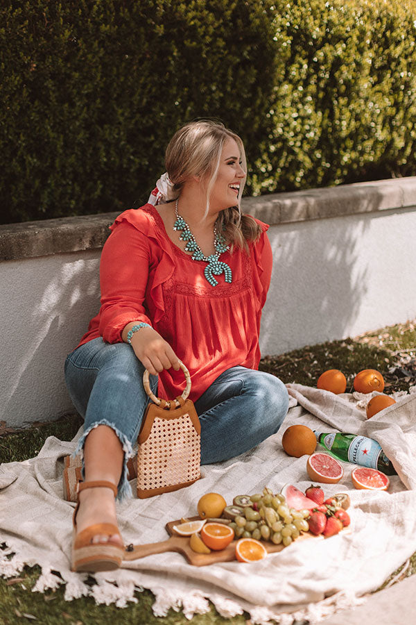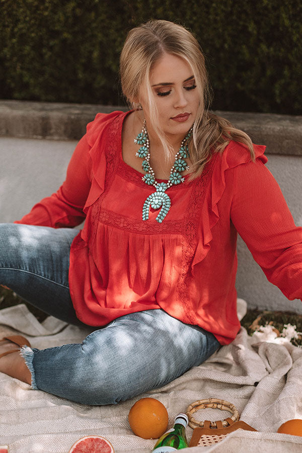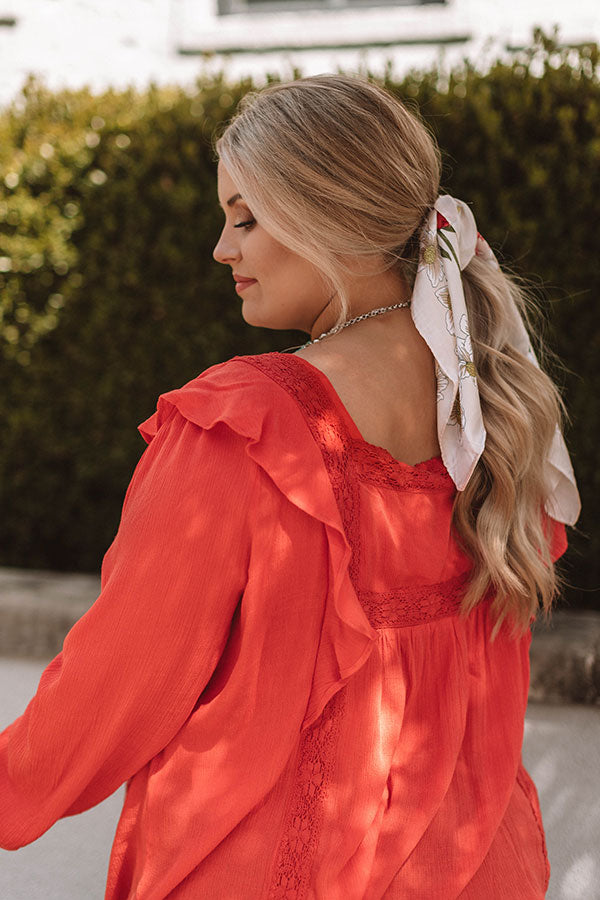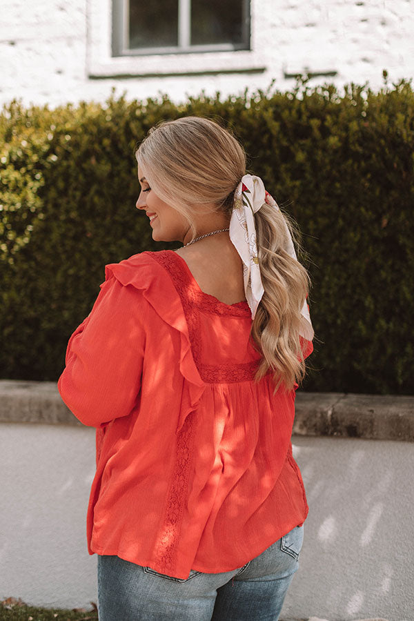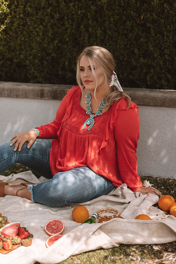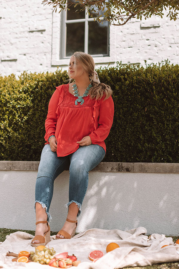 Plus Size - You will be "charmingly chic" when you wear this scarlet shift top adorned with a square neckline and back, long sleeves, ruffled vertical seams, crochet detailing, and loose fit with a rounded hem! You can style this elegant piece with distressed shorts and a neutral wedge, faux suede hat, and fringe crossbody for a cute and casual summertime look, or you can pair it with our "Santorini Sunshine Trousers in White" and "The Parker Faux Suede Lace Up Heel in Scarlet" for an adorable working girl outfit! Measurements