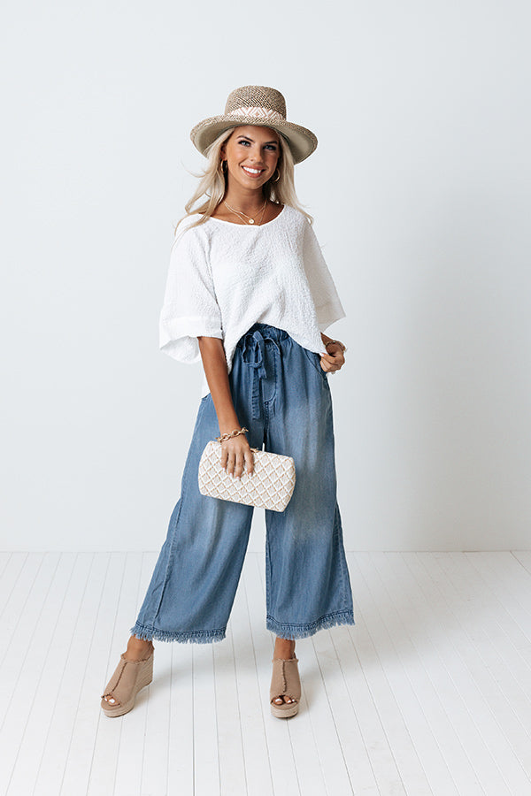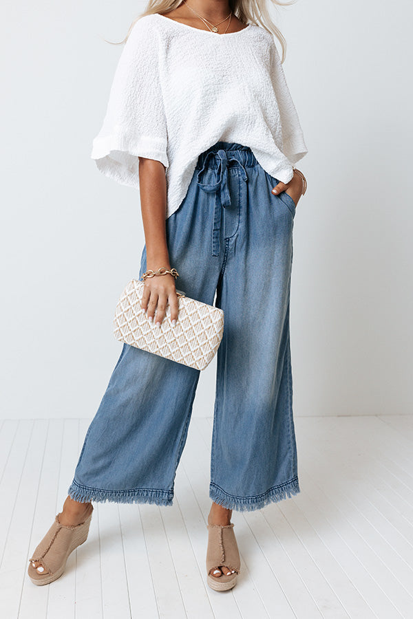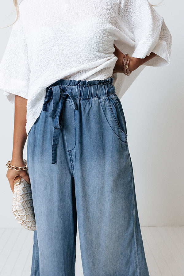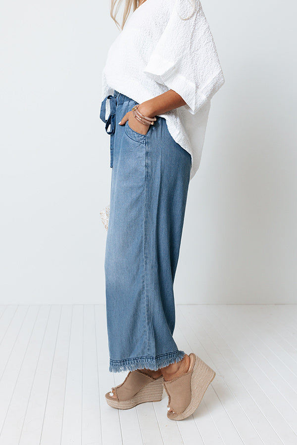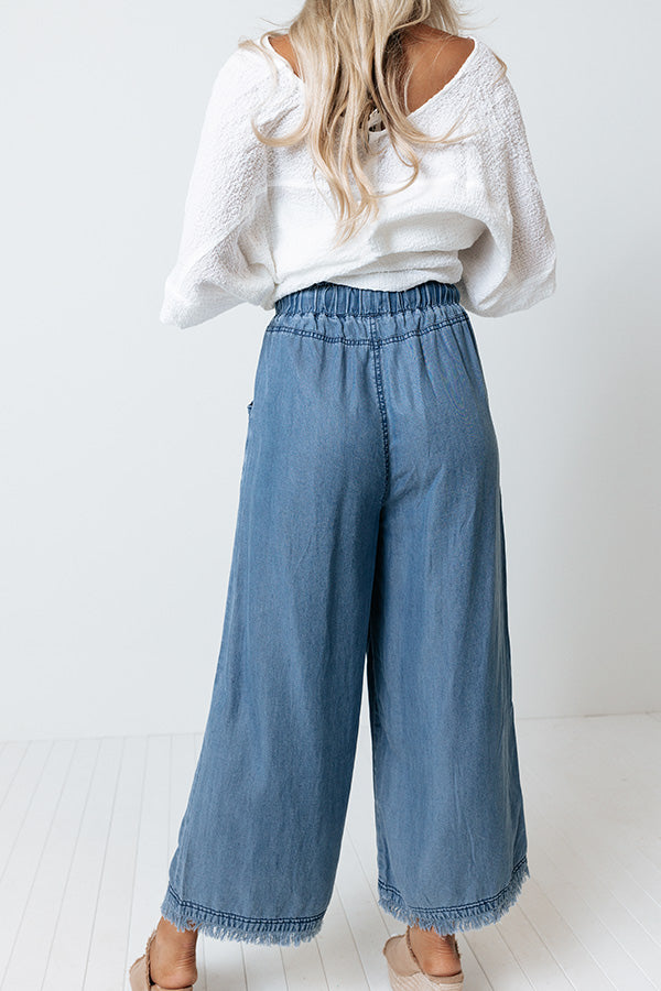 Dream big in these charming pants featuring lightweight medium wash chambray material with accent fading, a high elastic waistline with a tie closure, accent side pockets, and a relaxed silhouette that falls into frayed ankle-length hemlines! Measurements