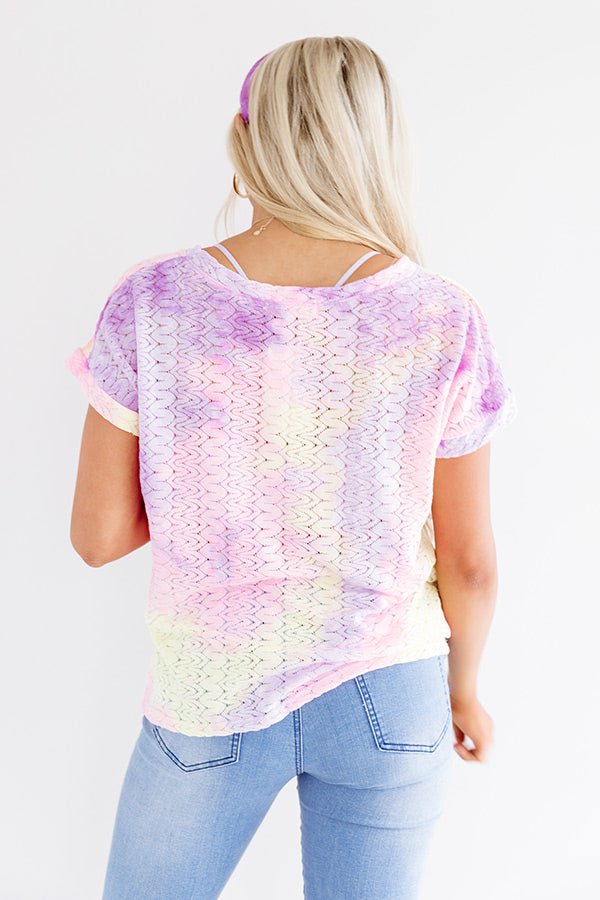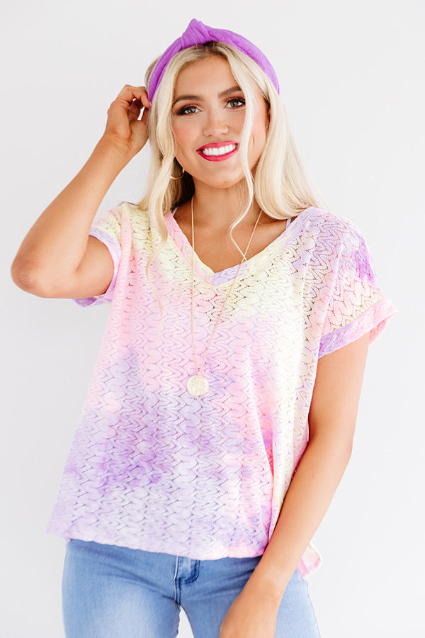 Live life colorfully in our trendy "Chasing Fireflies" top featuring soft lightweight material with an intricate knit pattern, pink, purple, and yellow hued tie dye, a wide v-cut neckline that can be worn off one shoulder, short loose sleeves, and a relaxed silhouette that falls into a straight high/low hemline with accent side slits! We have styled this cutie with some light wash flares, a headband, and neutral wedges, but you can also wear it with some distressed white shorts and our matching "Bellview Woven Flat in Pink!"