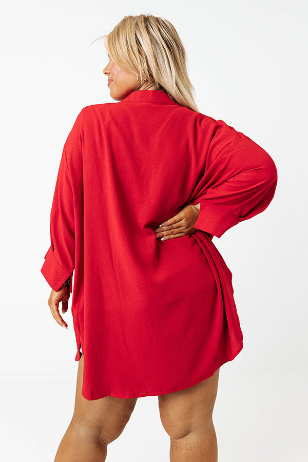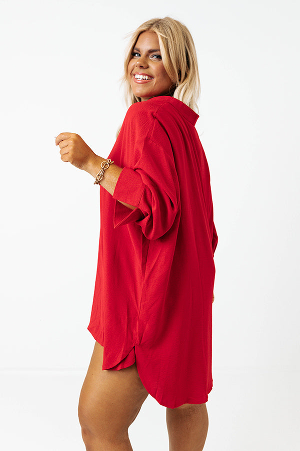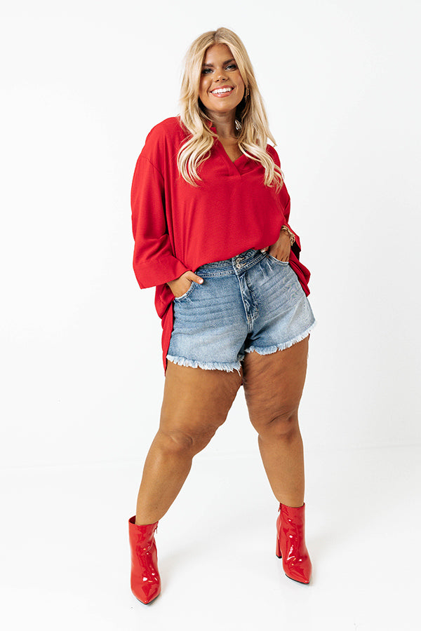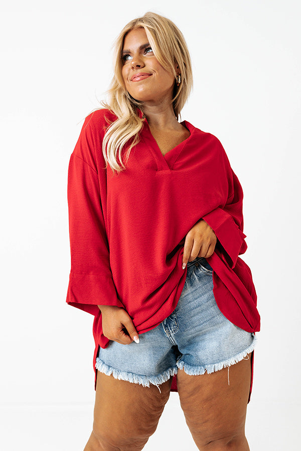 Our chic red plus size 'Chasing Love Shift Top' features lightweight material, a v-cut neckline, loose 3/4-length sleeves with split cuffs, and a relaxed silhouette that falls into a rounded hemline!