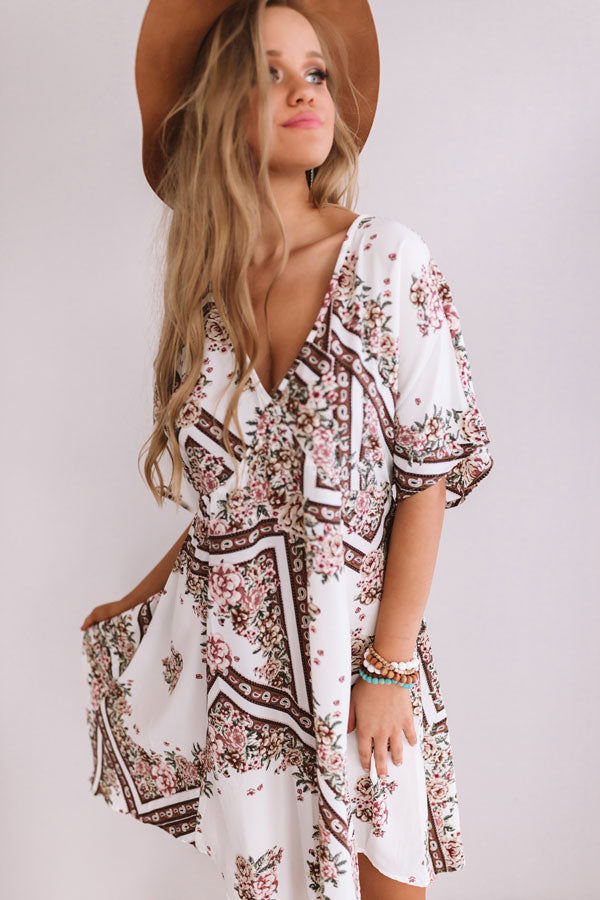 Create memories that will last a lifetime in this summer midi! It is decorated with a pastel floral pattern and some darker paisley accent strips that dramatically pop off the white background! The v-neck and flowy fit will make you a show stopper when you pair it with a stunning summer hat and wedges! Measurements