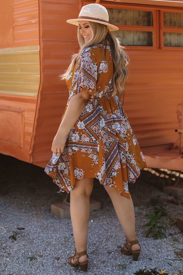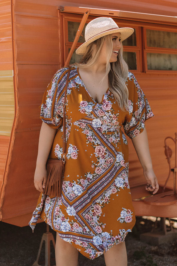 Plus Size - Create memories that will last a lifetime in this summer midi! It is decorated with a pastel floral pattern and some darker paisley accent strips that dramatically pop off the mustard background! The v-neck and flowy fit will make you a show stopper when you pair it with a stunning summer hat and wedges! Measurements