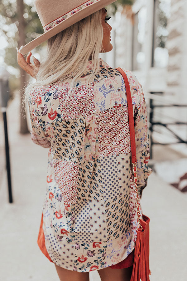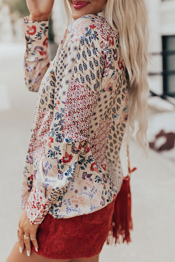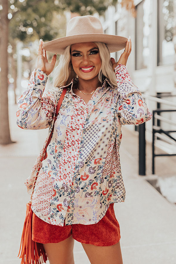 The perfect fall top does exist and it's our beautiful iced latte colored 'Chat With Me' top featuring lightweight satin material patterned with a stunningly colorful floral print, a button down front with a collared neckline, long loose sleeves with button closure cuffs, and a relaxed silhouette that falls into a straight hemline!