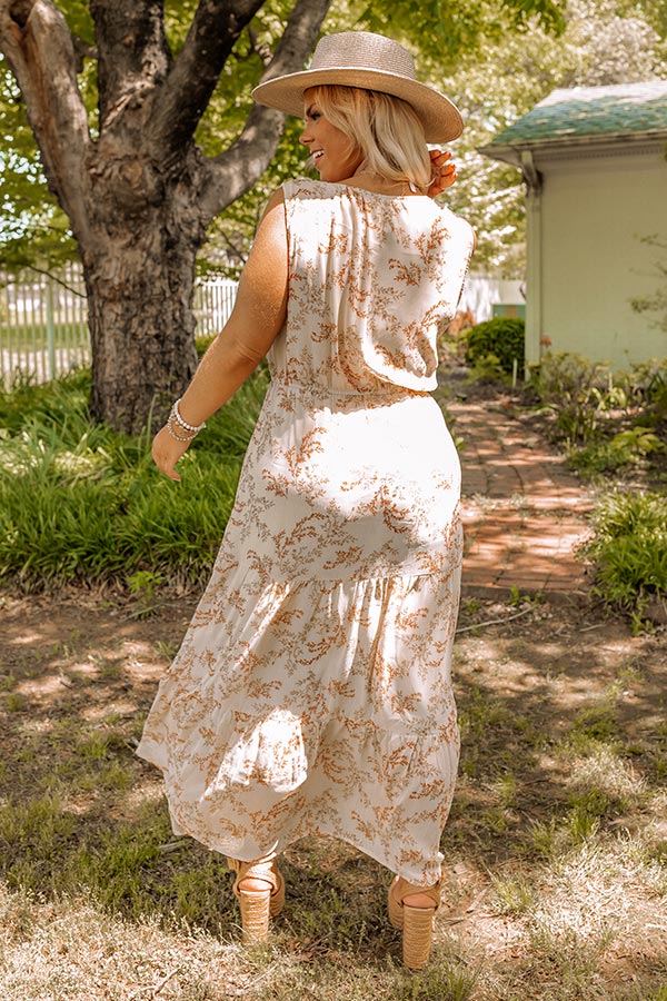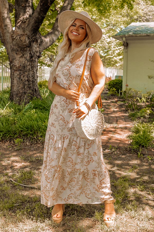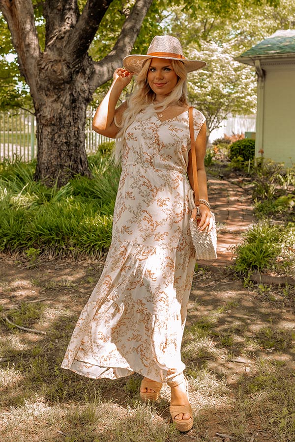 Get dressed to impress in our pretty light beige colored plus size 'Check Her Stories Midi' featuring lightweight breezy material patterned with a burnt orange and natural hued floral print, a v-cut neckline, wide sleeveless shoulder straps, and a relaxed tired skirt silhouette that cascades into a straight ankle-length hemline!