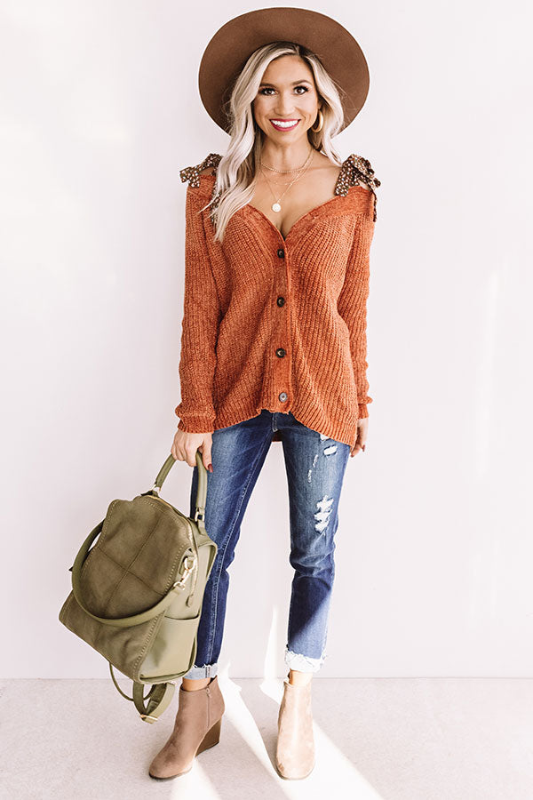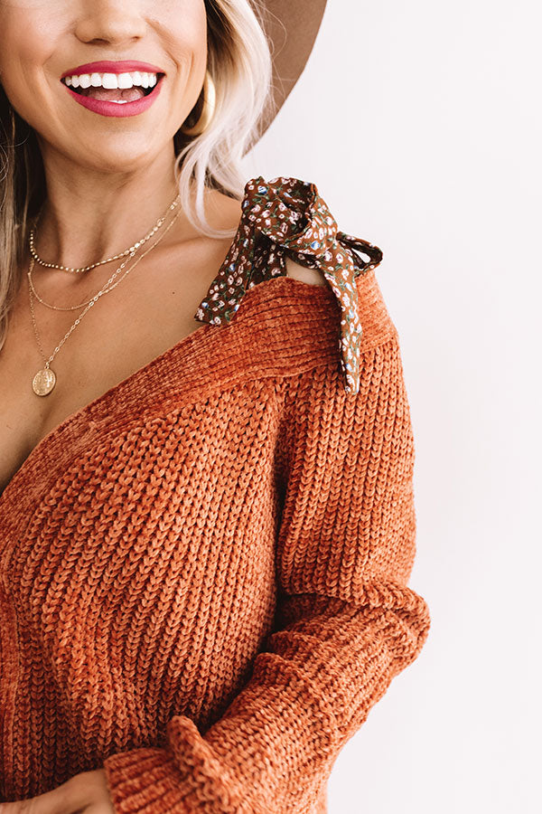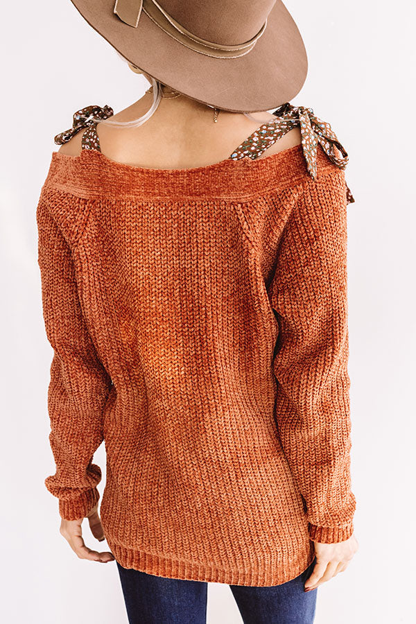 You will be so cheerful at how comfortable this rust hued sweater is when you wear it with its soft loose knit material, subtle ribbed texturing, long fitted sleeves, a wide neckline with cold shoulder cutouts and floral ribbon closures, a tortoise shell button up bodice, and a relaxed silhouette that falls into a straight hemline! This adorably intricate piece styles perfectly with some distressed ankle skinnies, a colored backpack, and a neutral pointed bootie and faux suede hat, or with some charcoal flares and "The Jess Faux Suede Heel in Natural!" Measurements