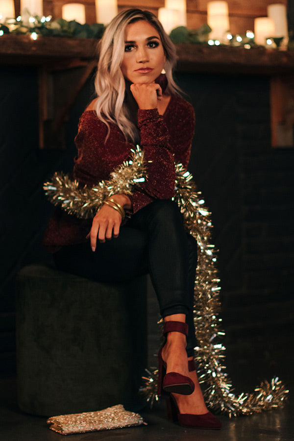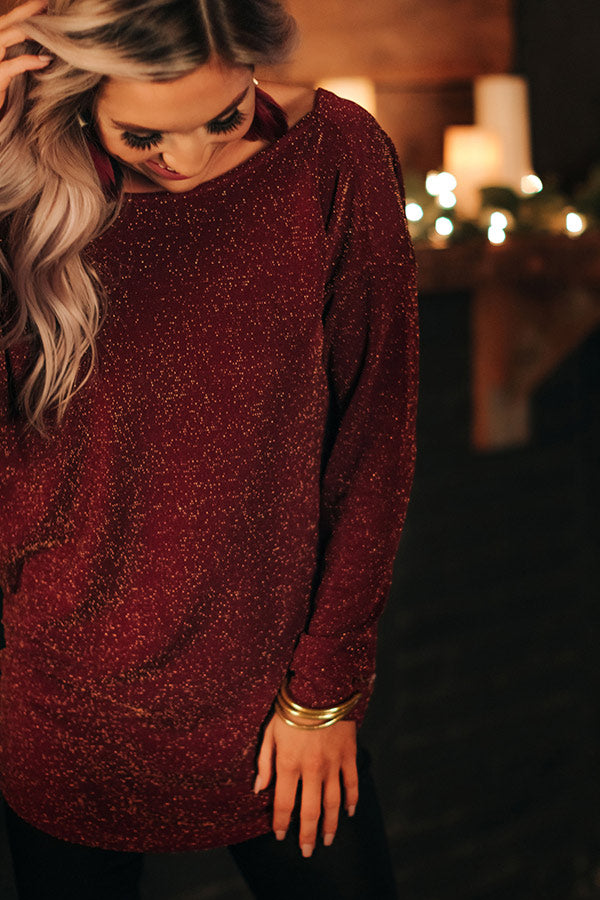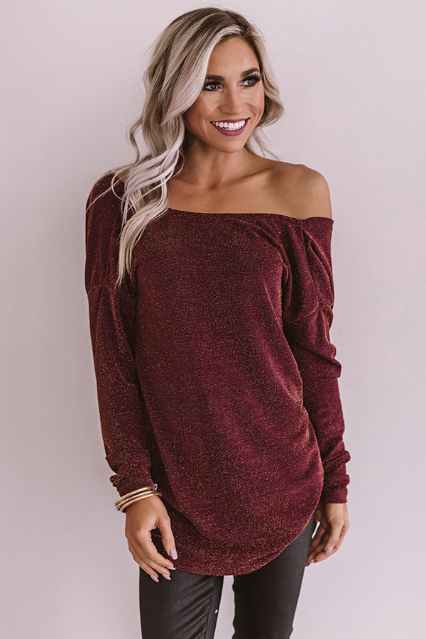Add a shimmering tough to your holiday wardrobe with our merlot colored "Cheers And Applause" top featuring soft lightweight material with subtle texturing and metallic gold accents, a high rounded neckline that can be worn to one side, long semi-fitted sleeves, a v-cut twisted back, and a relaxed silhouette that falls into a rounded hemline! We have styled this flirty piece with some black faux leather leggings, matching pumps, and glitzy clutch, but you can also wear it with some distressed ankle skinnies, "The Miller Faux Leather Bootie in Black," and our "All Caught Up Headband in Black!" Measurements