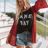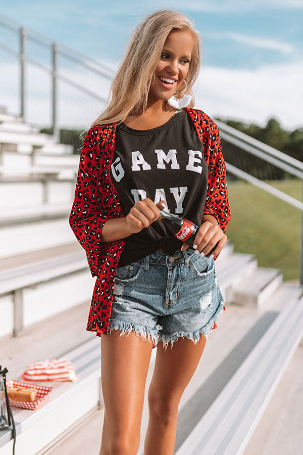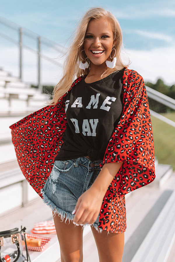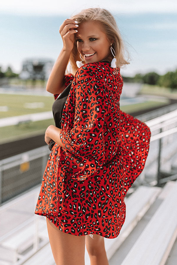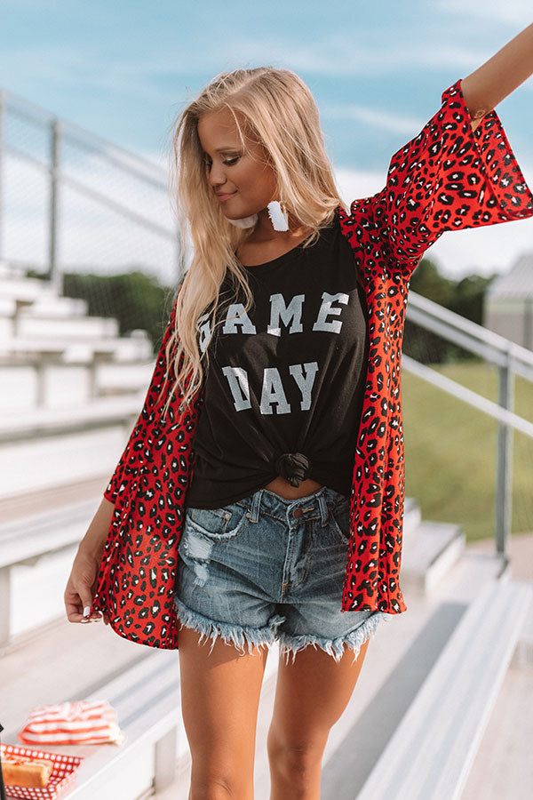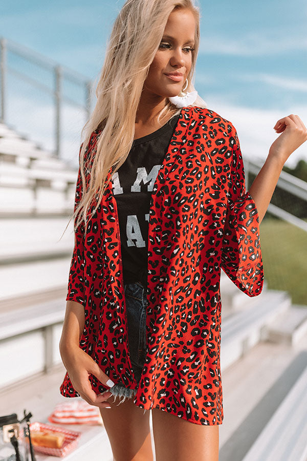 There is no better way to look stylish on game day than to wear the red "Cheers And Kisses" overlay featuring a fierce leopard print, open front, and breezy sleeves! We have styled this bold piece with some distressed shorts, a black graphic tank, and a black bootie and transparent crossbody, but it also looks great paired with some denim flares, "The Scout Faux Suede Peep Toe Bootie in Stone" and our "Vintage Vibes Felt Hat in Black!" Measurements