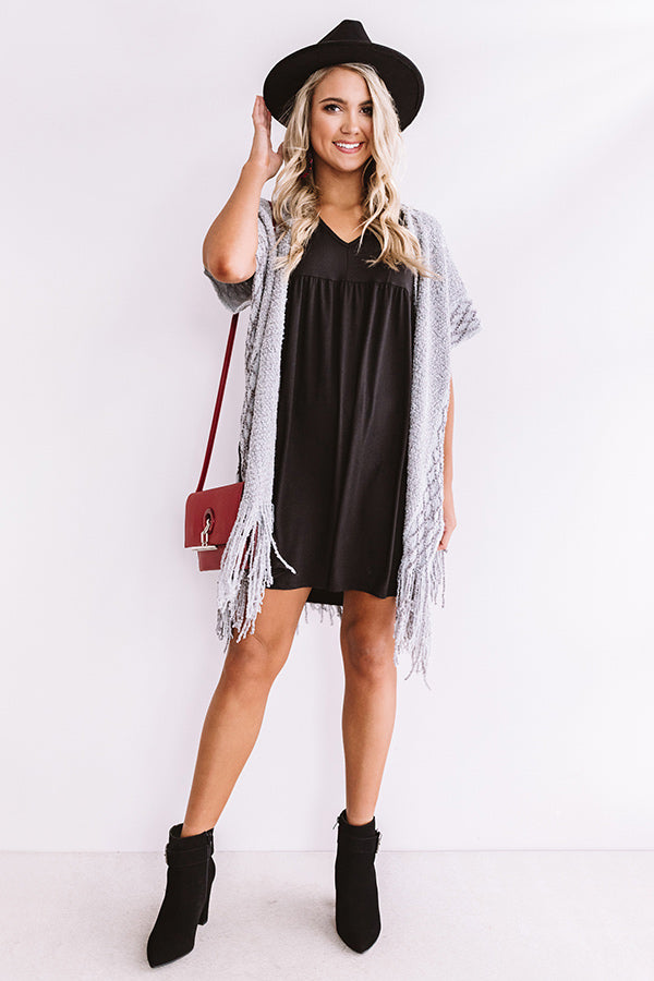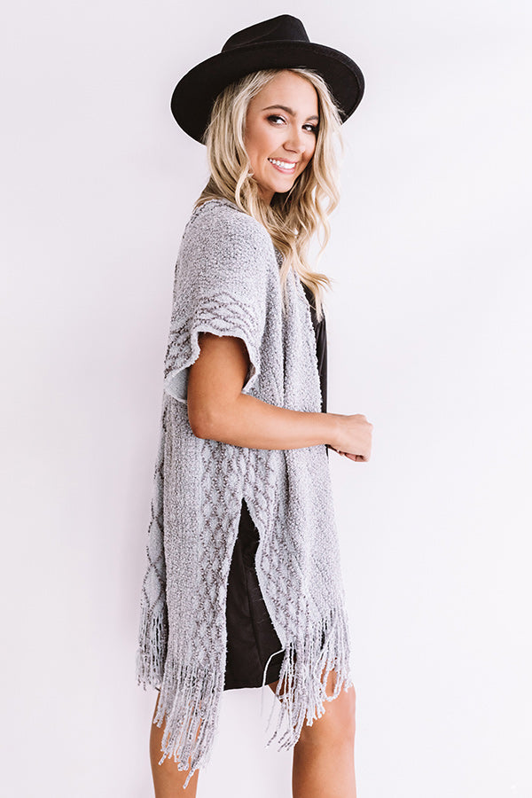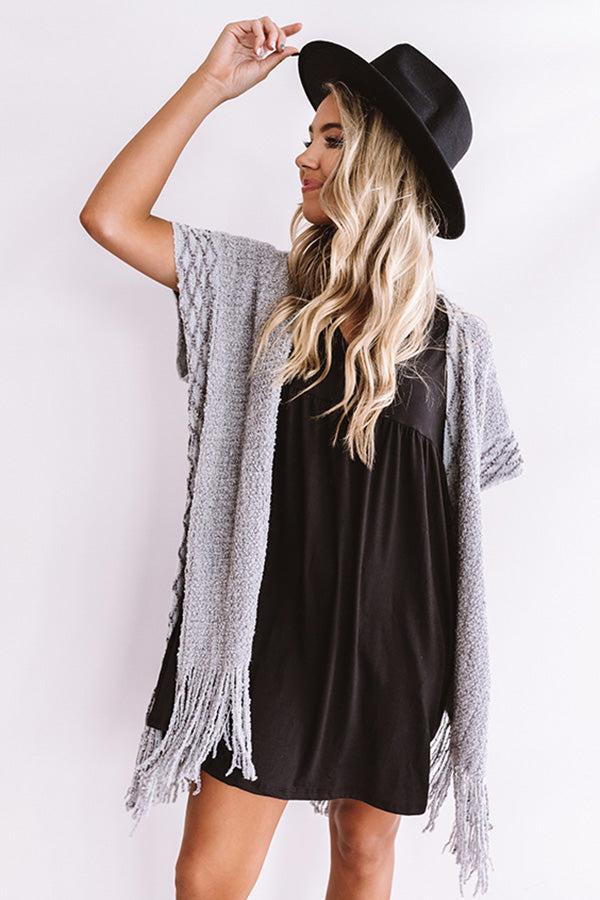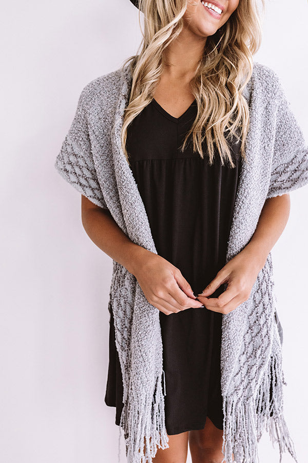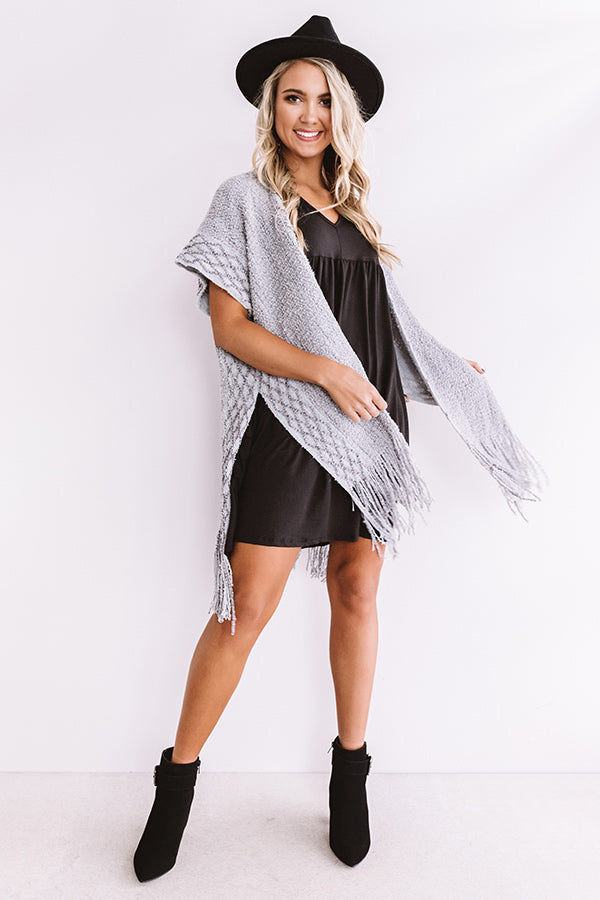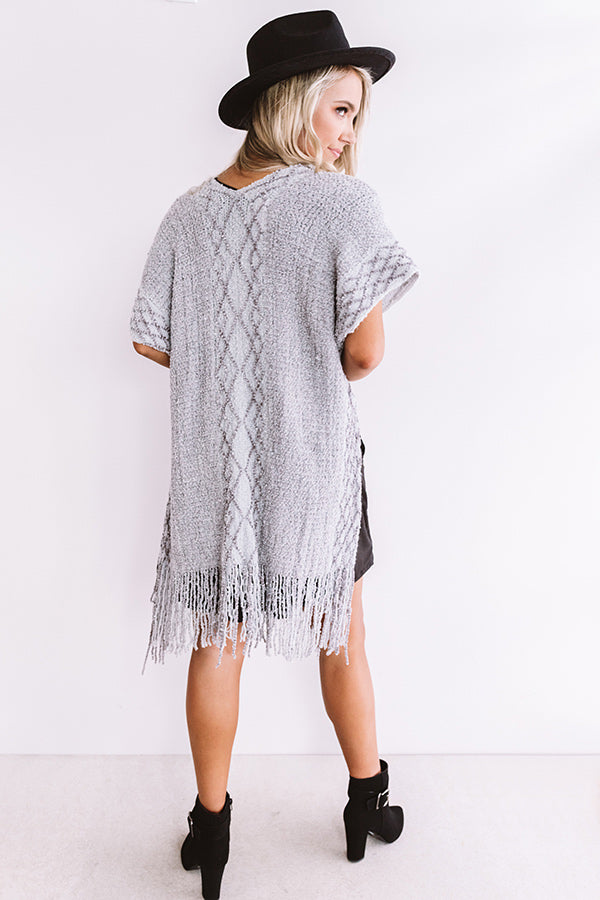 You will "cheer for coziness" when you wear this warm grey poncho featuring soft loose knit material, a v-cut upper back, short loose sleeves, subtle abstract patterns, an relaxed open front silhouette, and a fringed upper thigh length hemline with high side slits! You can style this versatile piece with just about anything from a basic tank to a sweater, jeans to dresses, wedges to sandals, clutches to totes, and hats to earrings!