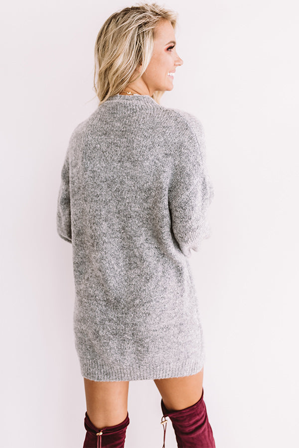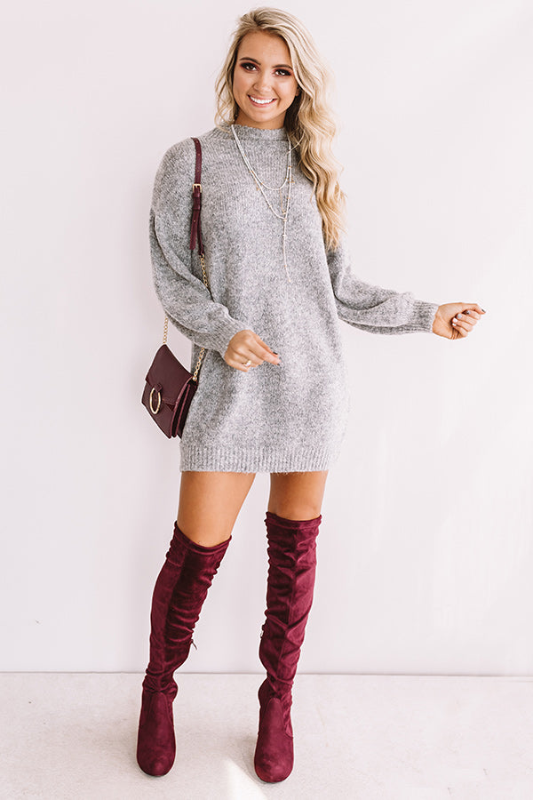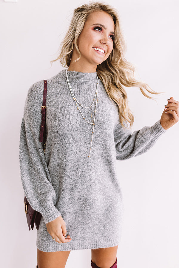 You will "cheer for coziness" when you wear this dark grey sweater dress featuring a soft and stretchy loose knit material, a high rounded turtle neckline, long oversized bishop sleeves with fitted cuffs, and an ultra relaxed silhouette that falls into a straight mid-thigh length hemline! This warm fall essential can be styled with a long statement necklace and a windsor wine over the knee boot and crossbody, or with "The Pryor Faux Leather Peep Toe Bootie in Blush" and our "All Caught Up Headband in Blush!" Measurements